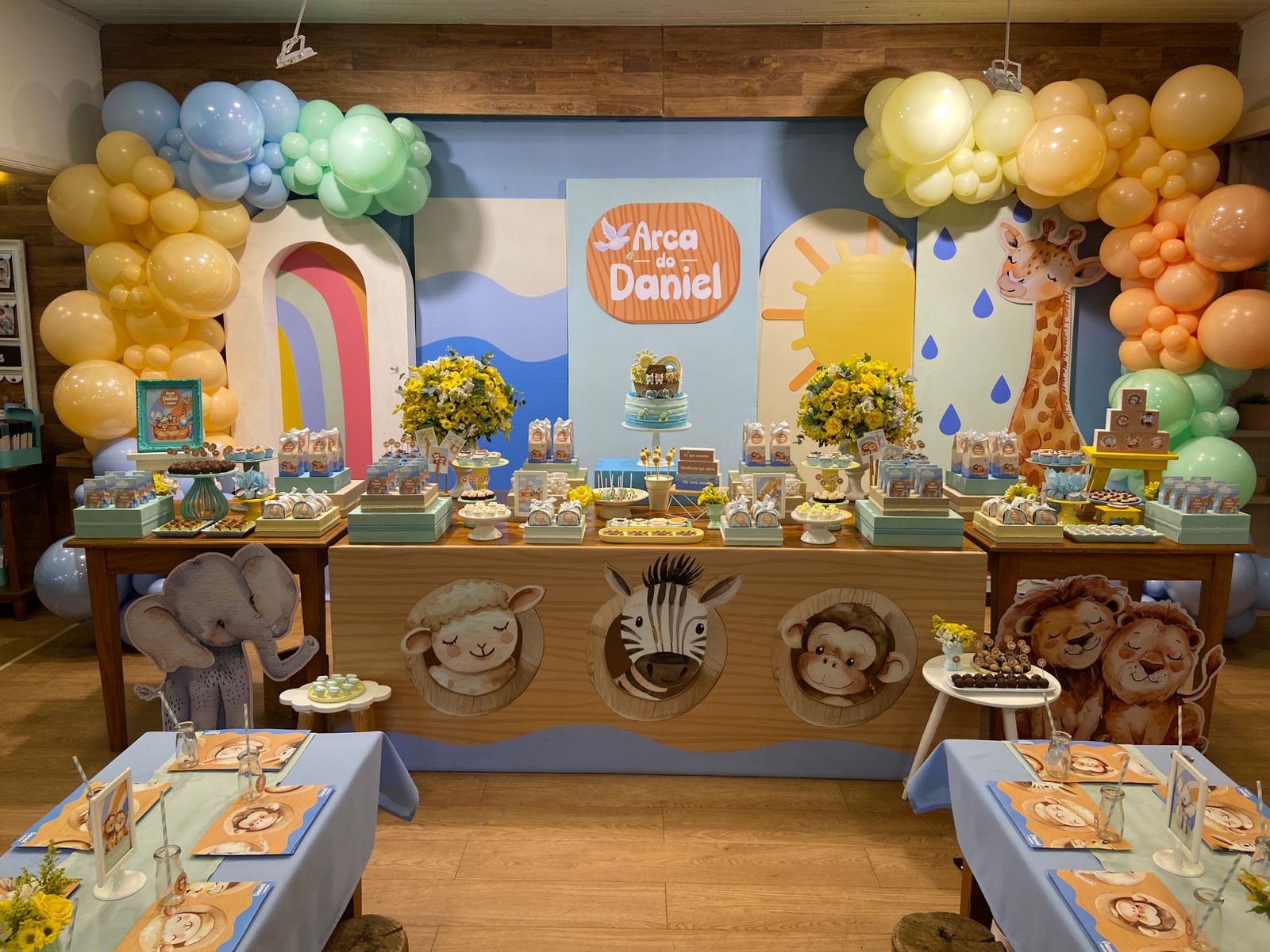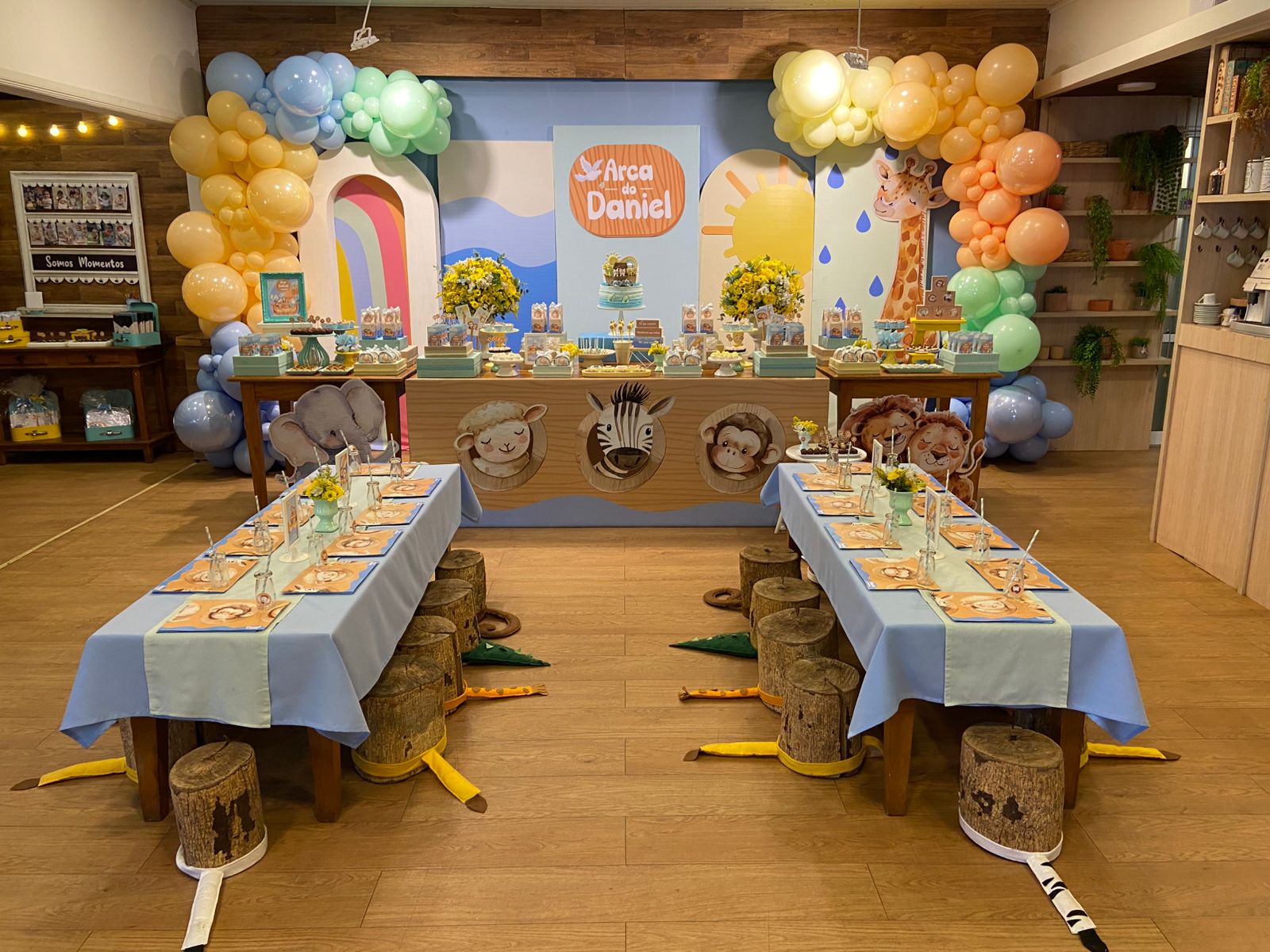 Uma decoração que remete ao azul do mar e aos animais da arca. Um misto da diversidade da natureza e a esperança que a Arca de Noé simboliza. A beleza da criação divina irá compor a decoração, com ponto alto nos rabinhos dos bichinhos onde as crianças sentam para almoçar, e criando memórias que durarão para sempre!