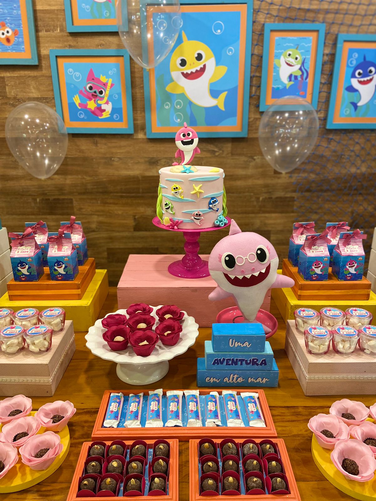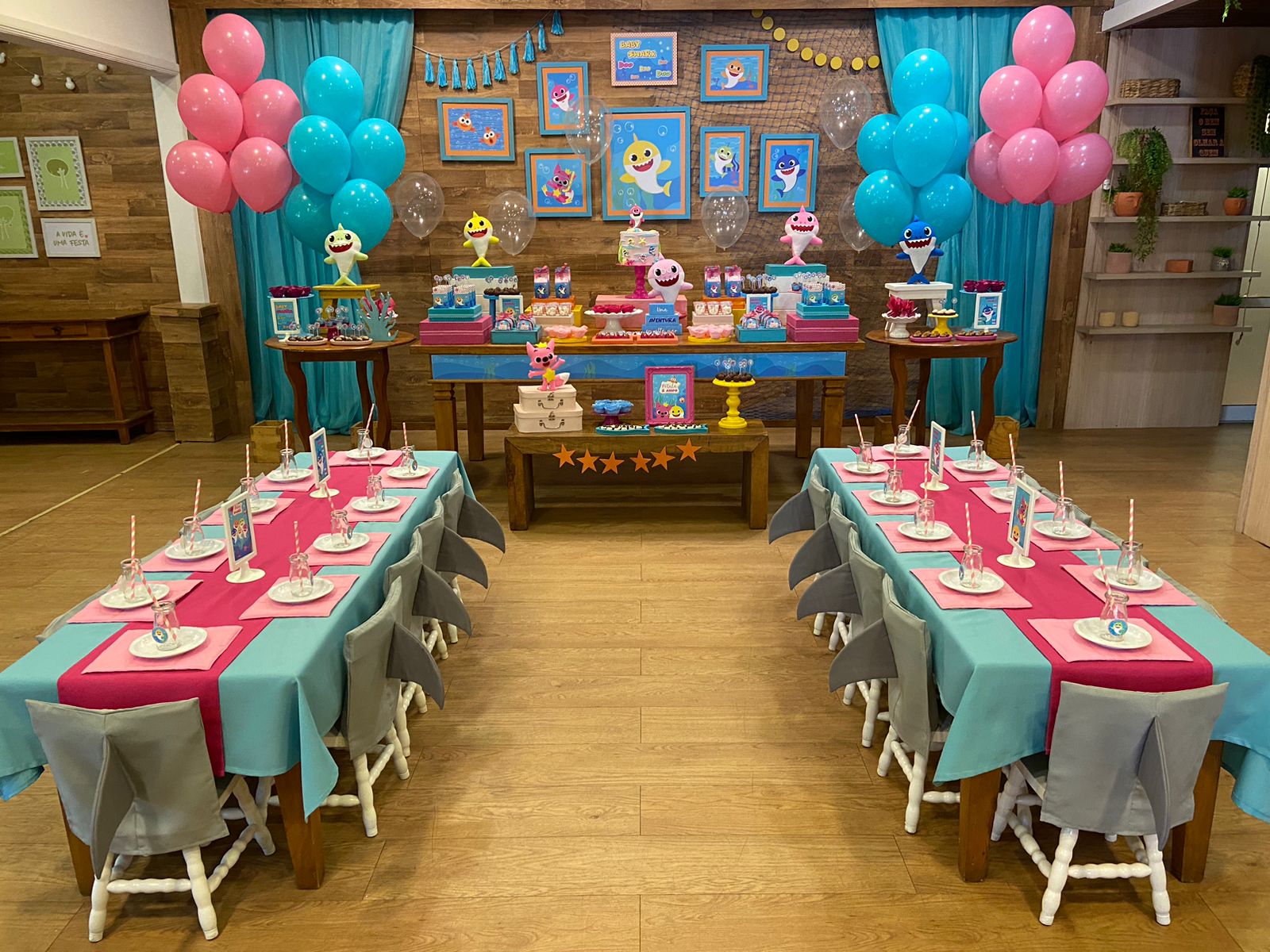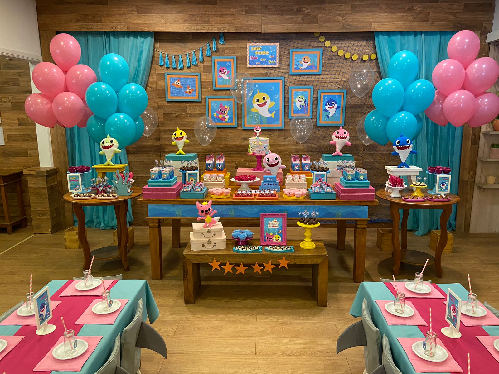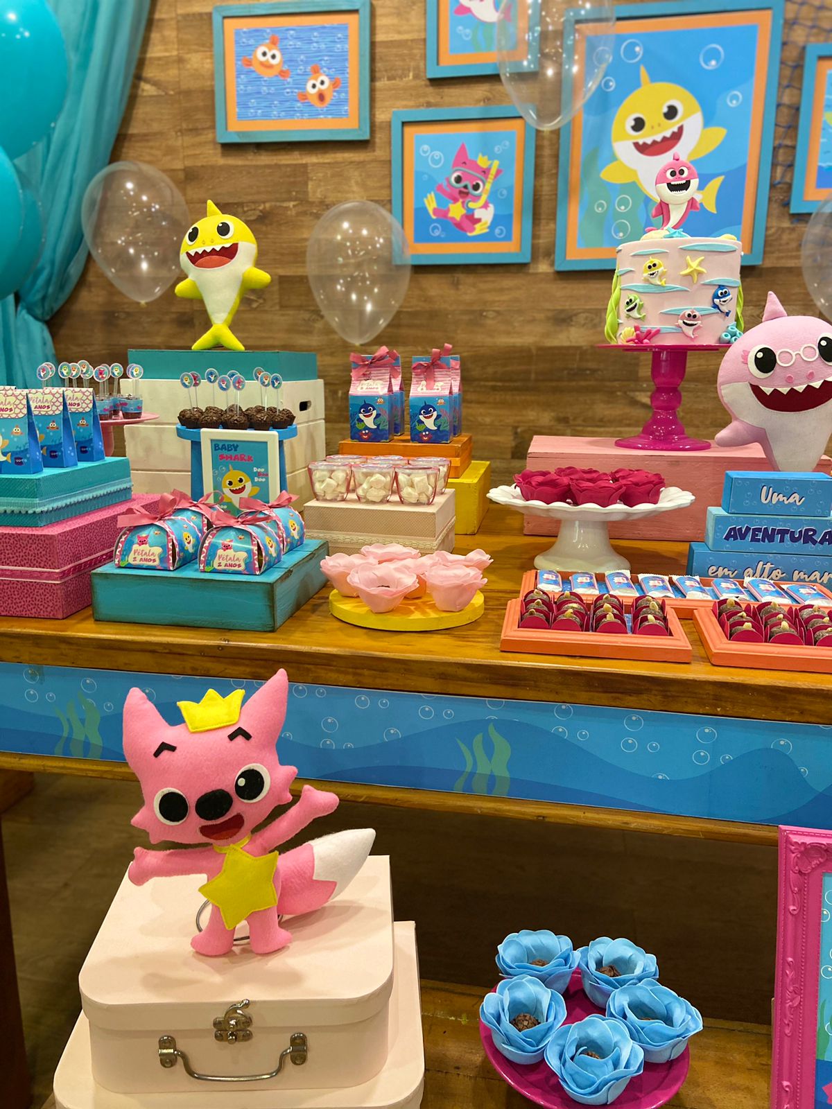Em um oceano de diversão, esta decoração é perfeita para os pequenos fãs do desenho. Cada detalhe é uma alegria para os olhos. Os personagens adoráveis do Baby Shark, como Pinkfong e sua família, estarão presentes para encantar os convidados. Prepare-se para cantar e dançar ao som das músicas contagiantes enquanto todos exploram a magia do oceano em um ambiente festivo e cheio de sorrisos.