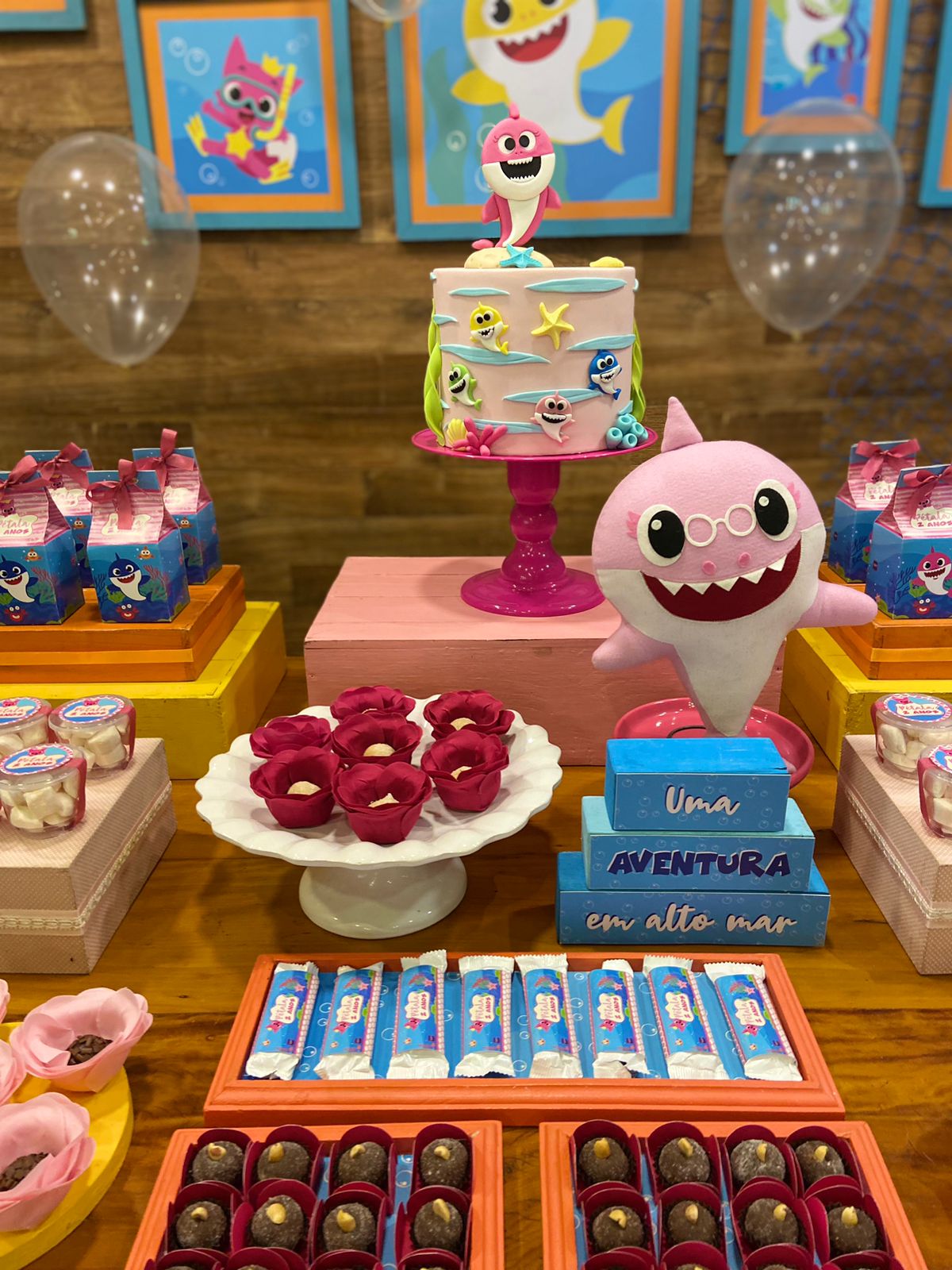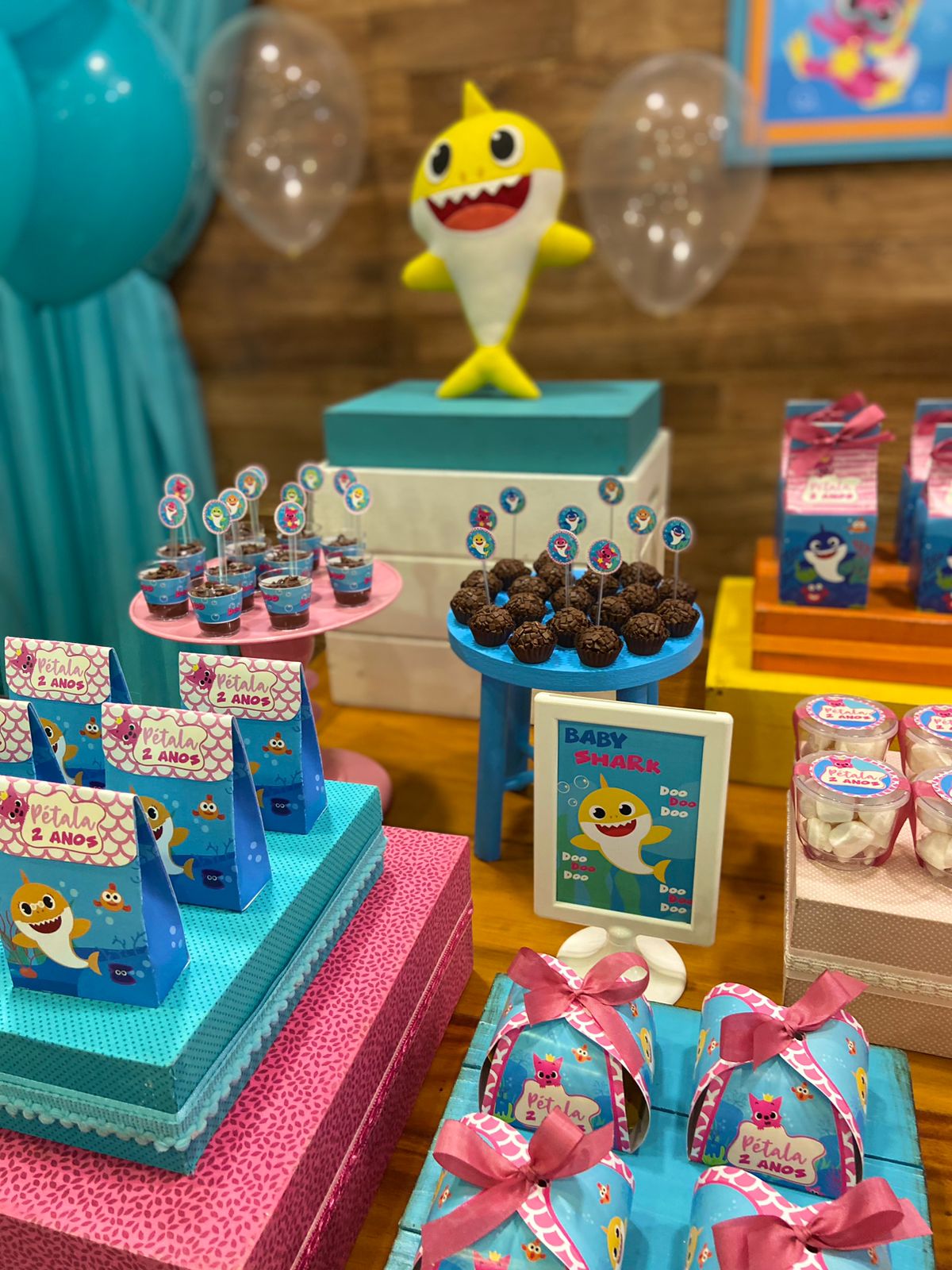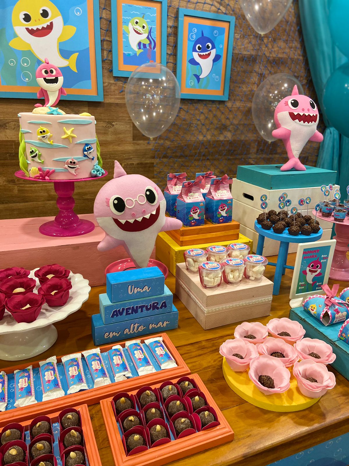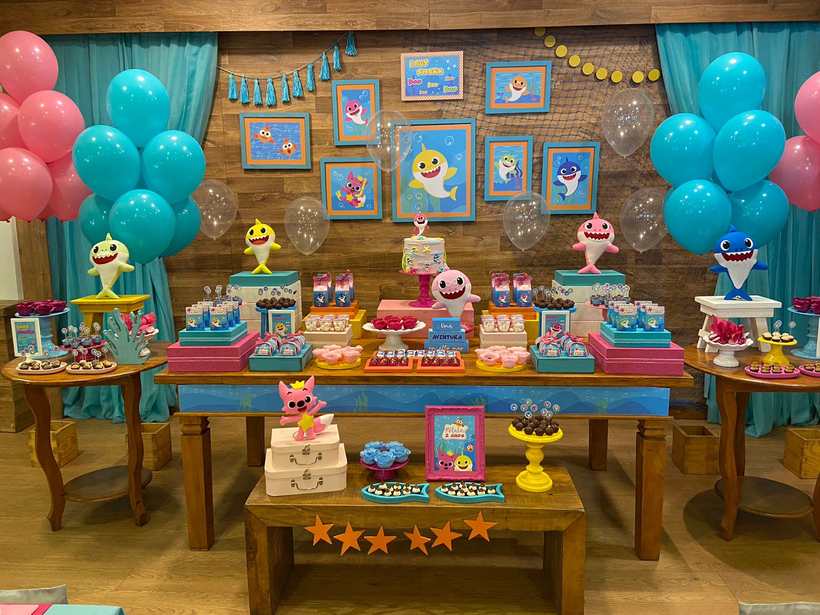 Em um oceano de diversão, esta decoração é perfeita para os pequenos fãs do desenho. Cada detalhe é uma alegria para os olhos. Os personagens adoráveis do Baby Shark, como Pinkfong e sua família, estarão presentes para encantar os convidados. Prepare-se para cantar e dançar ao som das músicas contagiantes enquanto todos exploram a magia do oceano em um ambiente festivo e cheio de sorrisos.