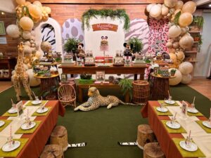 Uma releitura criativa e sofisticada do safari. A decoração aposta em tons terrosos e neutros, combinados com estampas de animais e elementos delicados da Minnie, criando um ambiente original, elegante e ao mesmo tempo divertido.