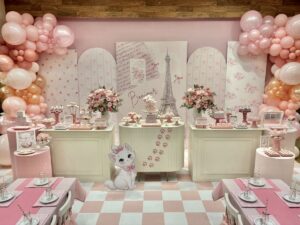 Prepare-se para uma festa cheia de doçura com a Gatinha Marie. Inspirado na clássica personagem de Aristocats, esse tema é perfeito para quem busca uma celebração cheia de detalhes, sem perder o encanto da infância. Com uma decoração marcante, as cores rosa e branco se combinam perfeitamente para criar um ambiente alegre, cheio de personalidade,