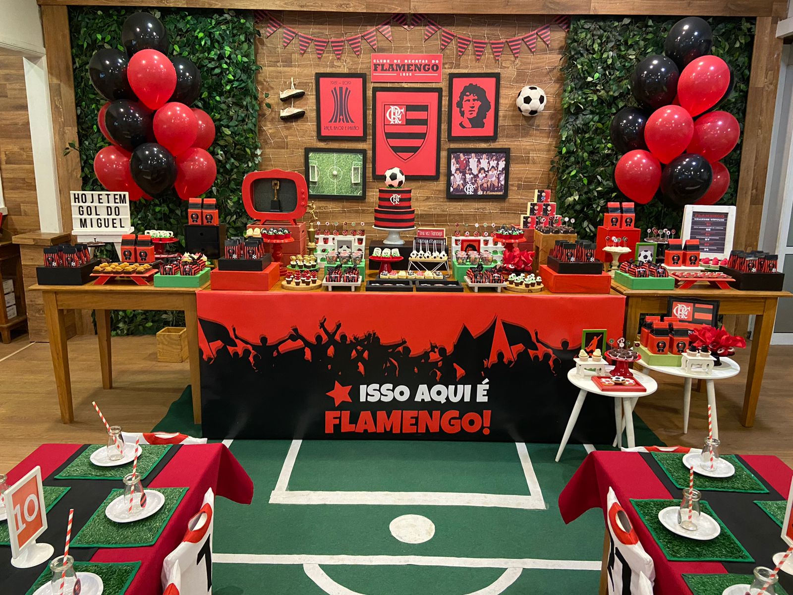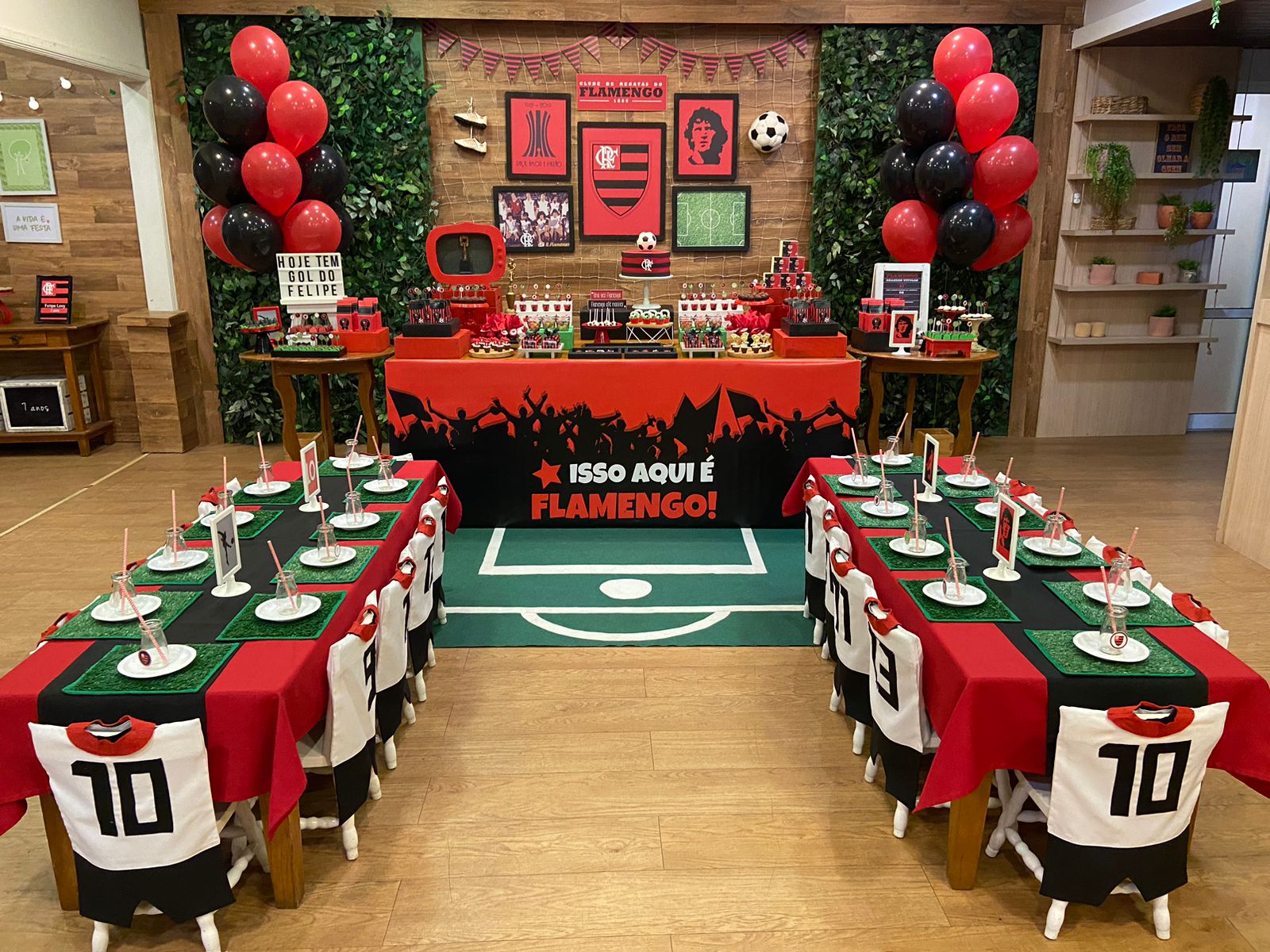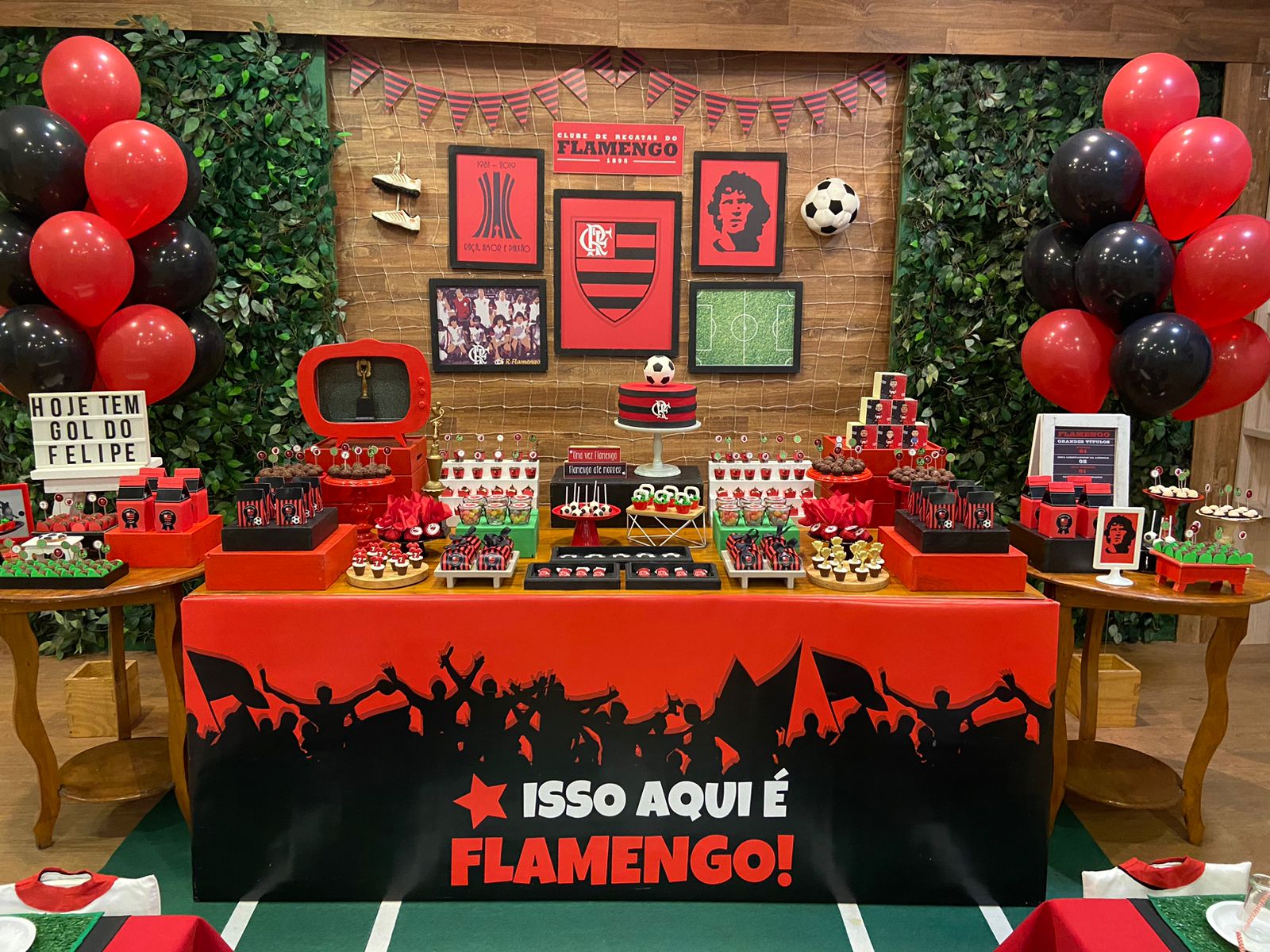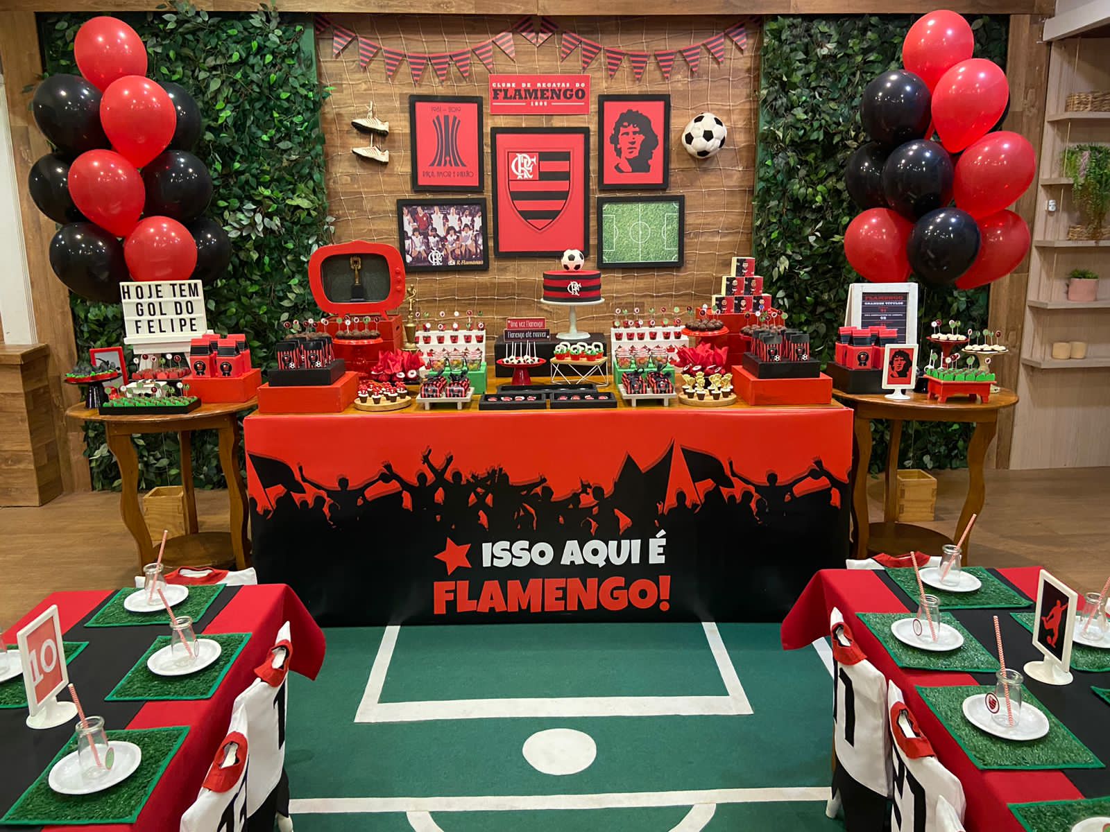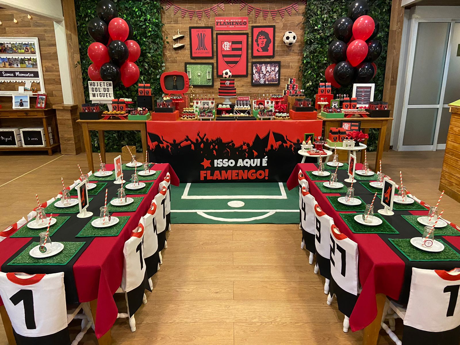 FlaFesta: Uma Celebração Rubro-Negra! Uma decoração que exala o espírito rubro-negro com as cores preto e vermelho, fotos dos craques do time e uma decoração inspirada no nosso amado gramado, que reflete a intensidade e a paixão pelo Flamengo. Não esqueça de registrar os momentos inesquecíveis no cantinho fotográfico do Mengão. Adereços e cenários temáticos proporcionarão a oportunidade perfeita para tirar fotos e eternizar o amor ao nosso Mengão.