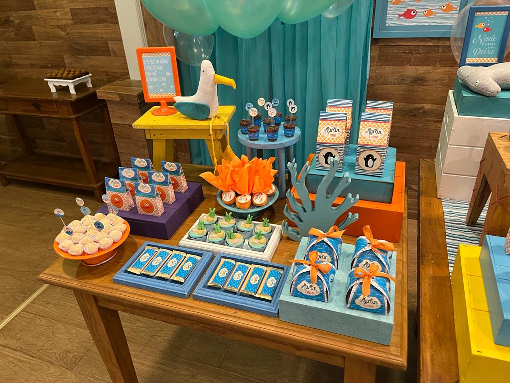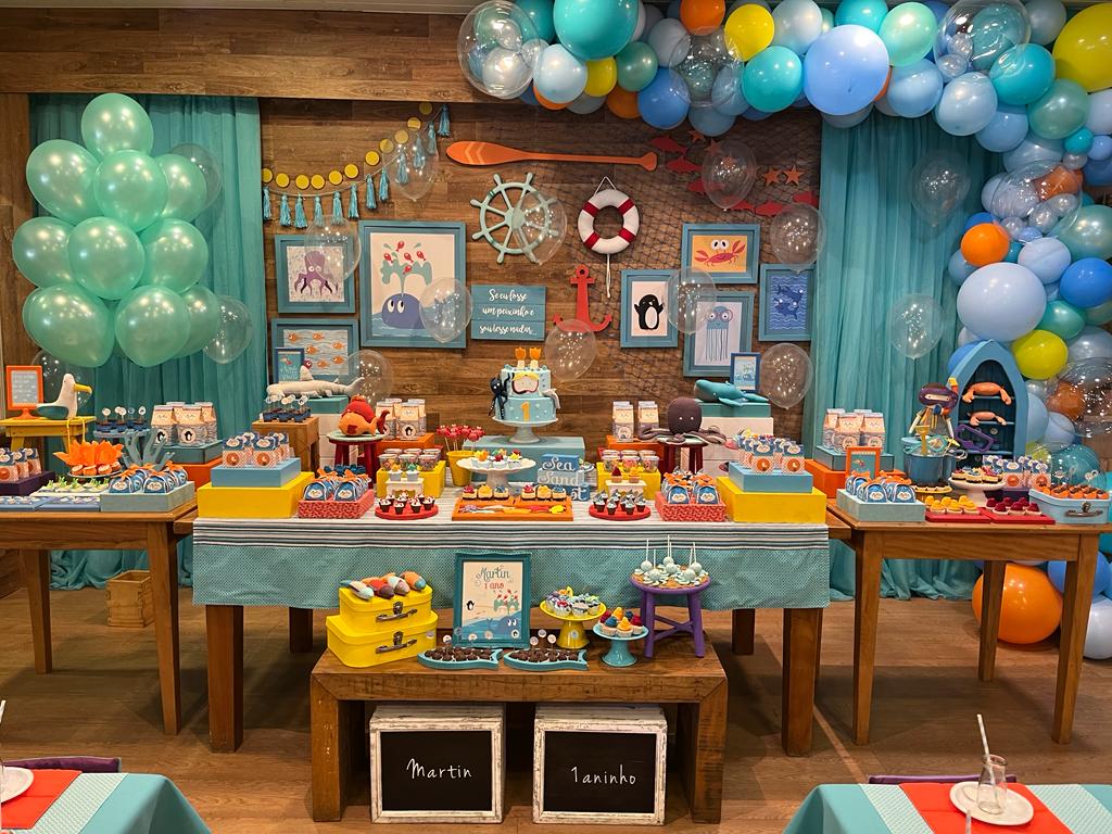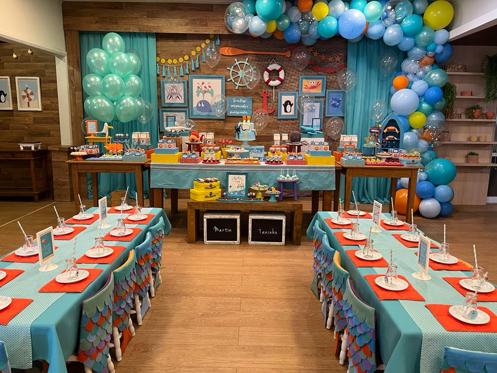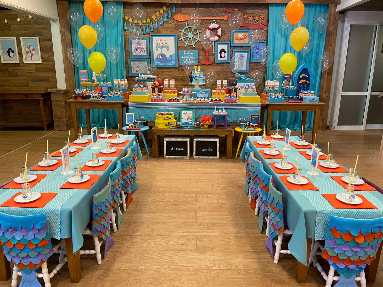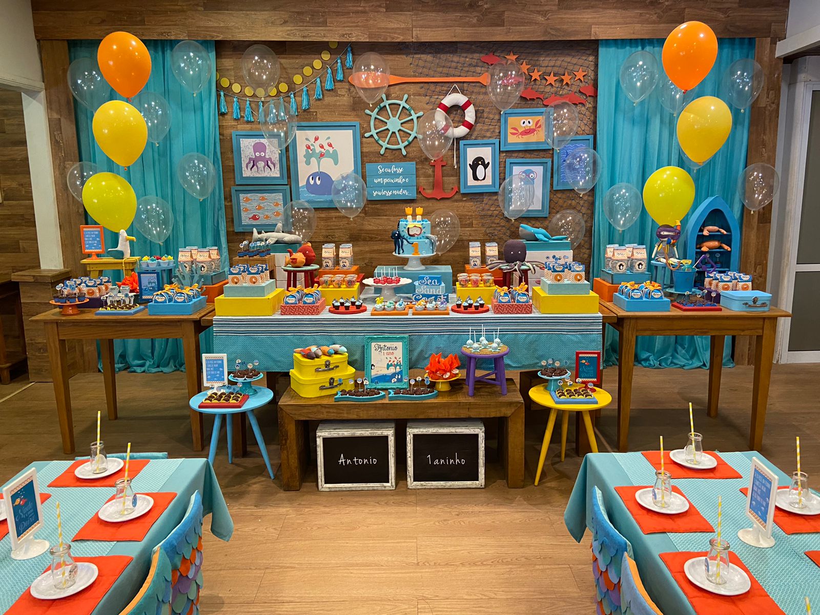 Preparem-se para mergulhar em um oceano de alegria e diversão na “Festa Submarina”. O local será transformado em um paraíso submarino, com balões, peixes, pinguins e caranguejos coloridos que criarão uma atmosfera mágica e animada. As cores vivas do laranja, azul e amarelo darão vida ao fundo do mar, tornando cada detalhe uma descoberta maravilhosa.