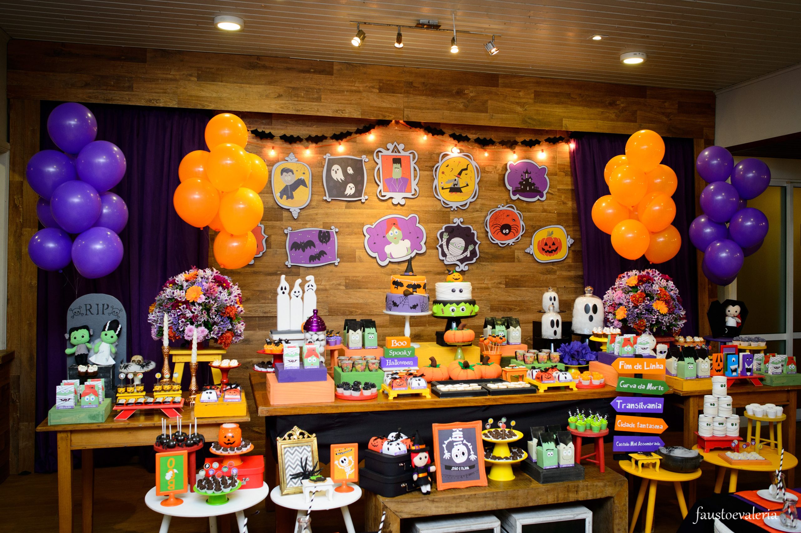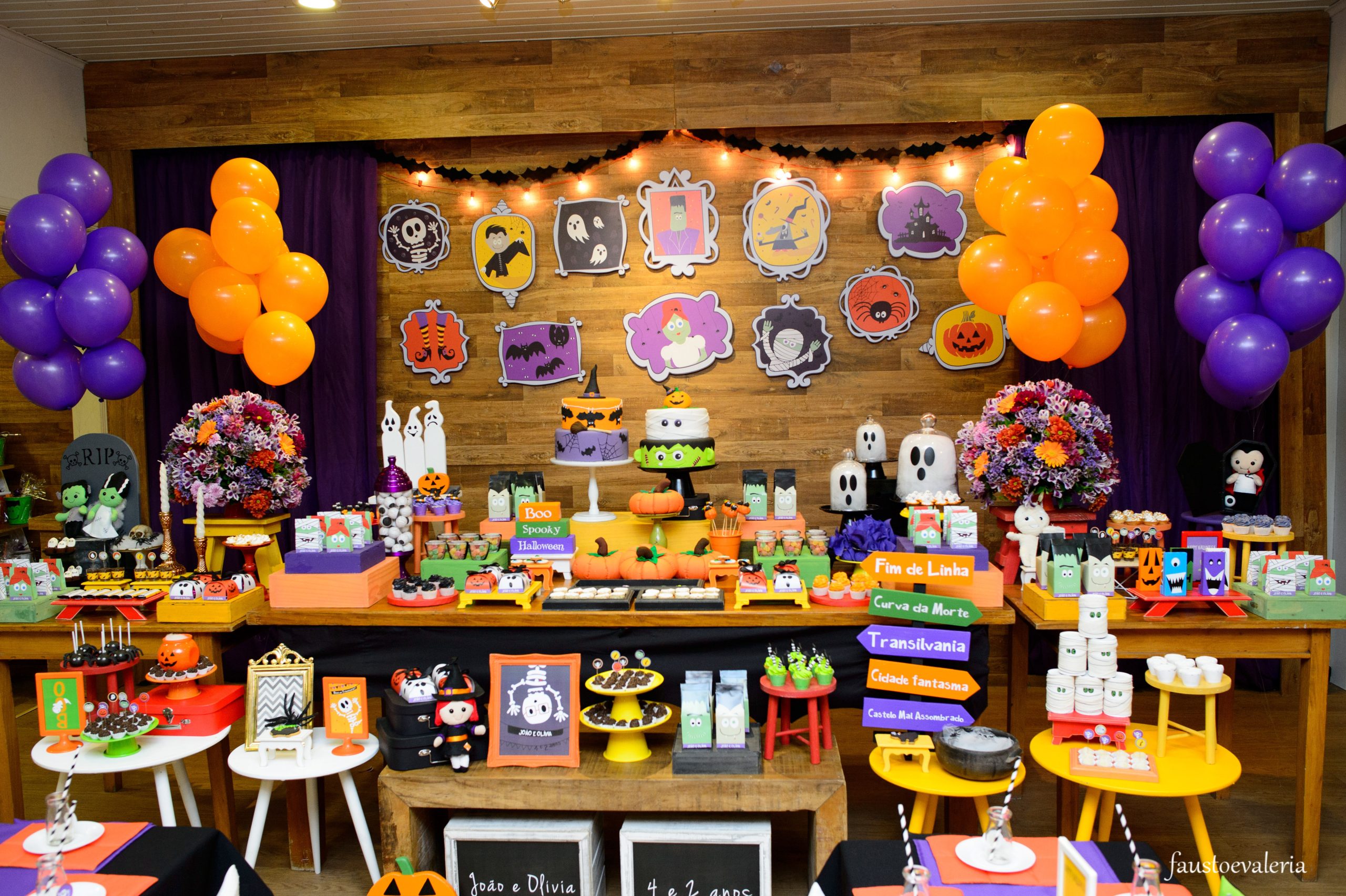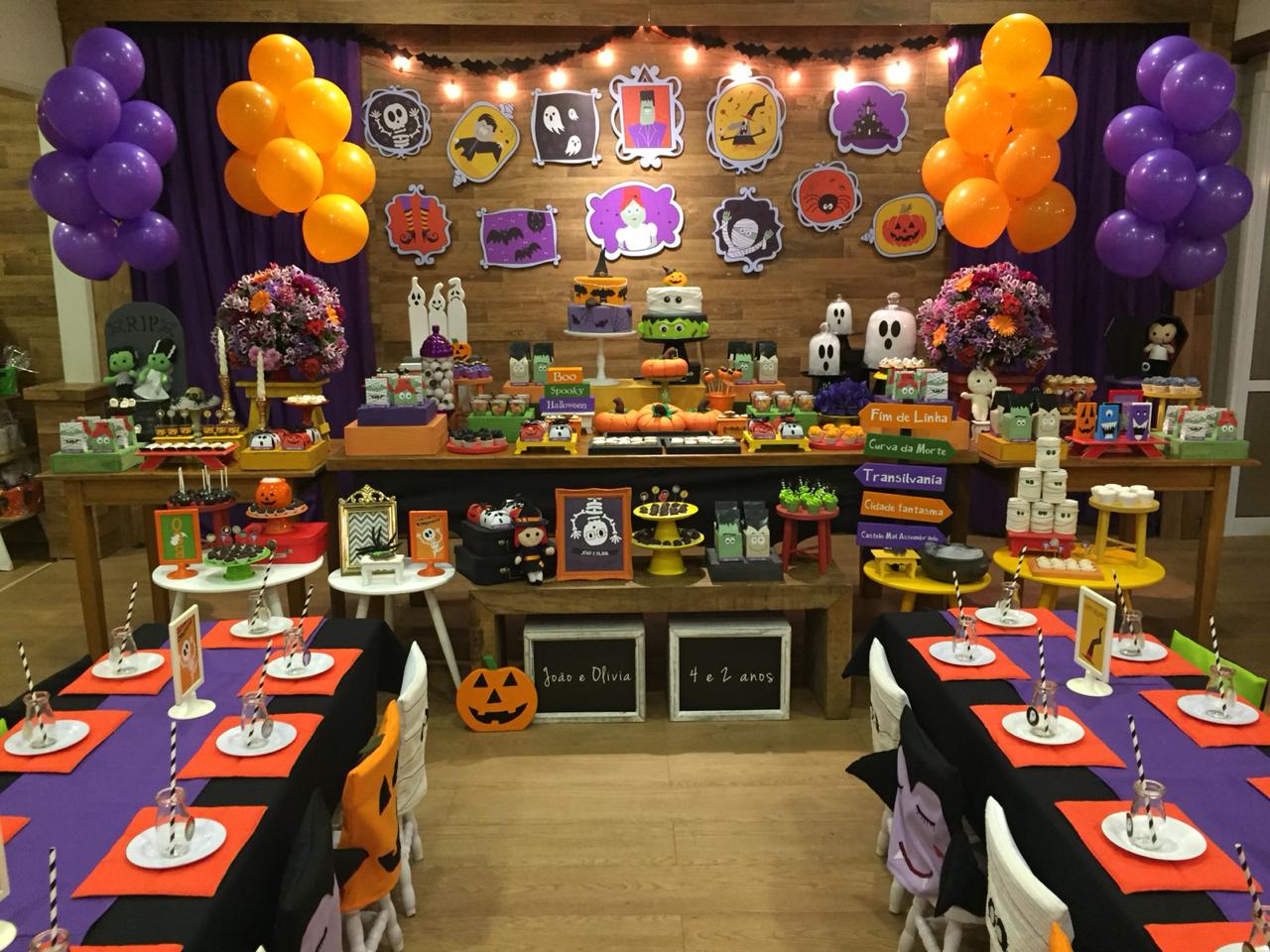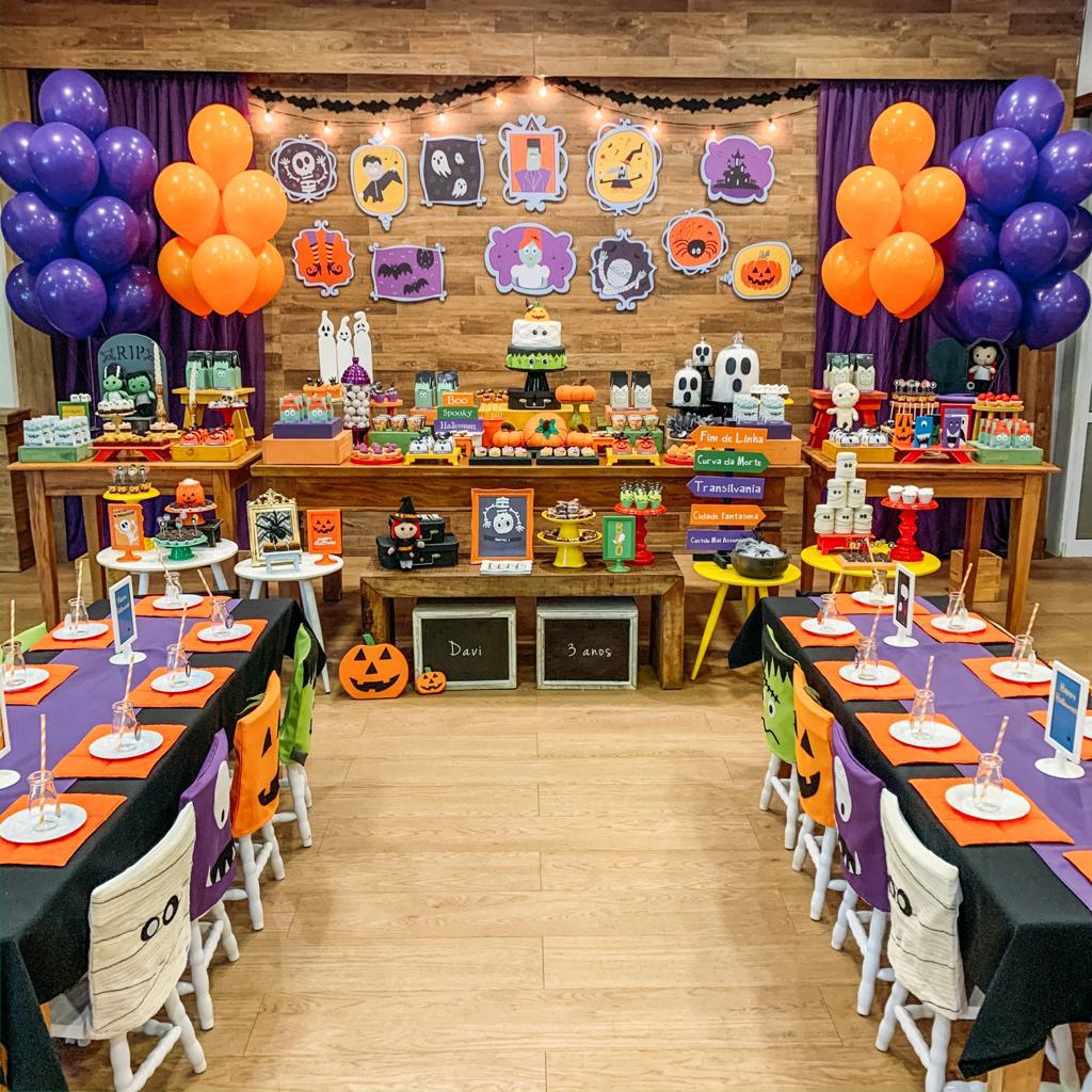 Uma decoração mágica e assustadoramente divertida envolve a festa com tema de Halloween, as cores vibrantes de laranja, preto e roxo darão vida a um mundo encantado, onde abóboras, bruxinhas, caveiras e múmias criarão uma atmosfera única de mistério e diversão para os pequenos.