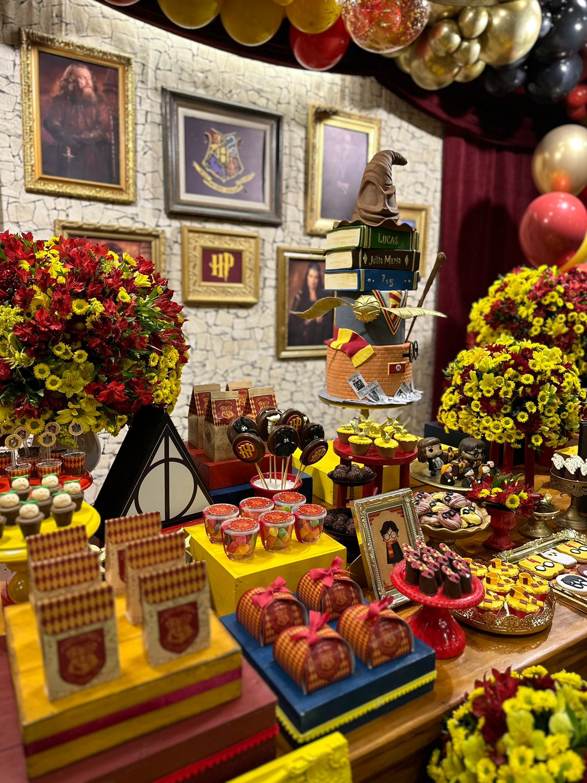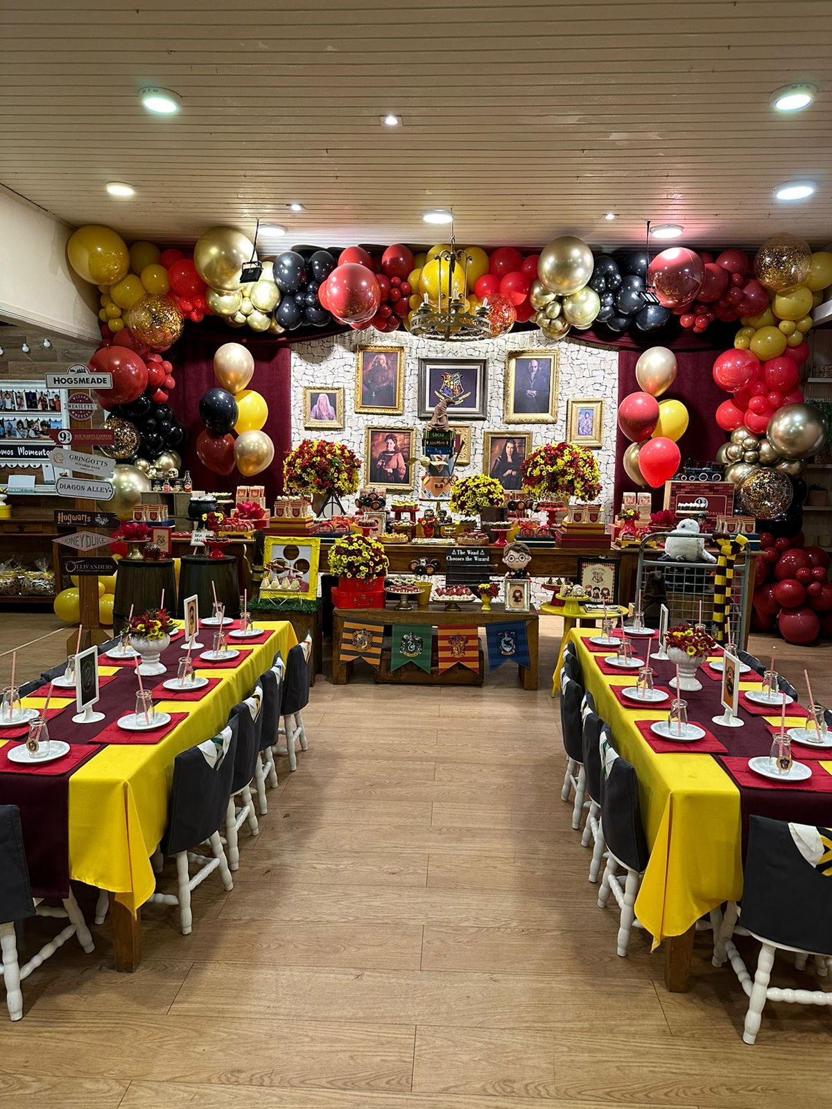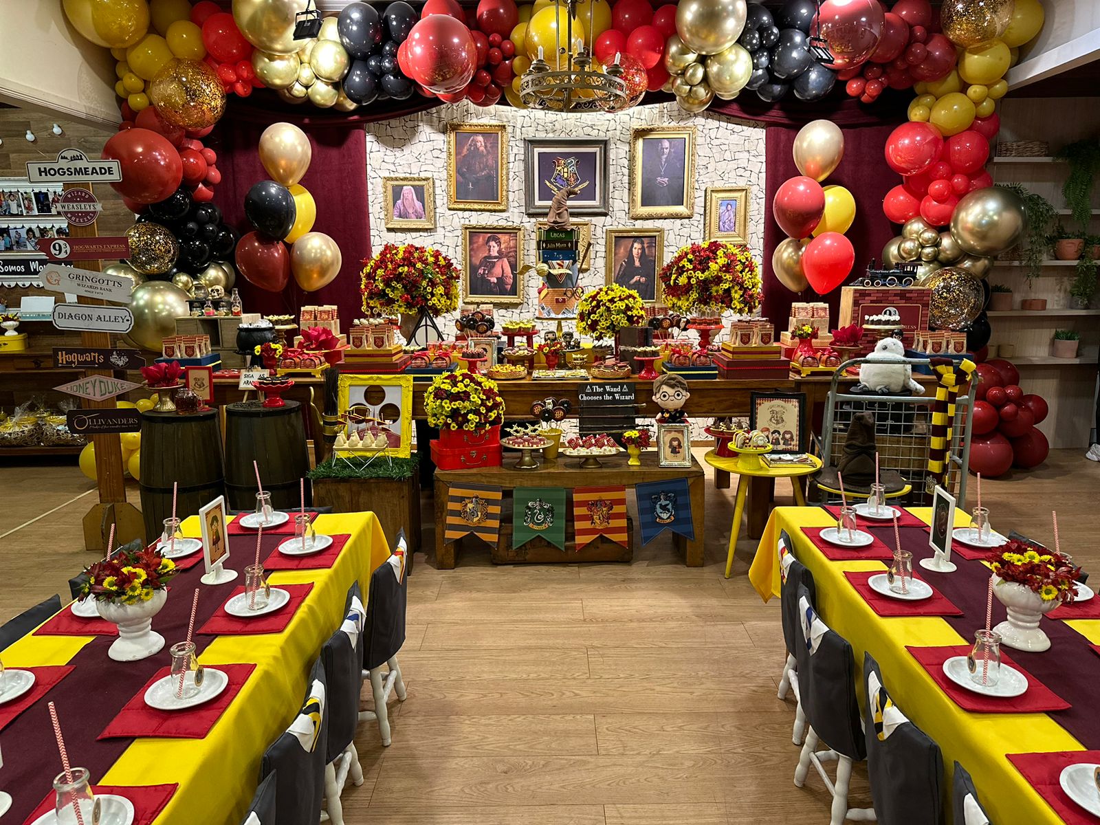 O tema Harry Potter transporta todos para o mágico universo de Hogwarts, repleto de aventura e mistério. A decoração recria o ambiente icônico do castelo, com detalhes que vão desde os chapéus seletores, varinhas até as casas de Gryffindor, Slytherin, Ravenclaw e Hufflepuff. As cores escuras, como o preto e o dourado, dão o toque mágico e elegante, fazendo os convidados se sentirem parte de uma verdadeira história de bruxos. Ideal para quem quer uma festa imersiva e cheia de encantamento!