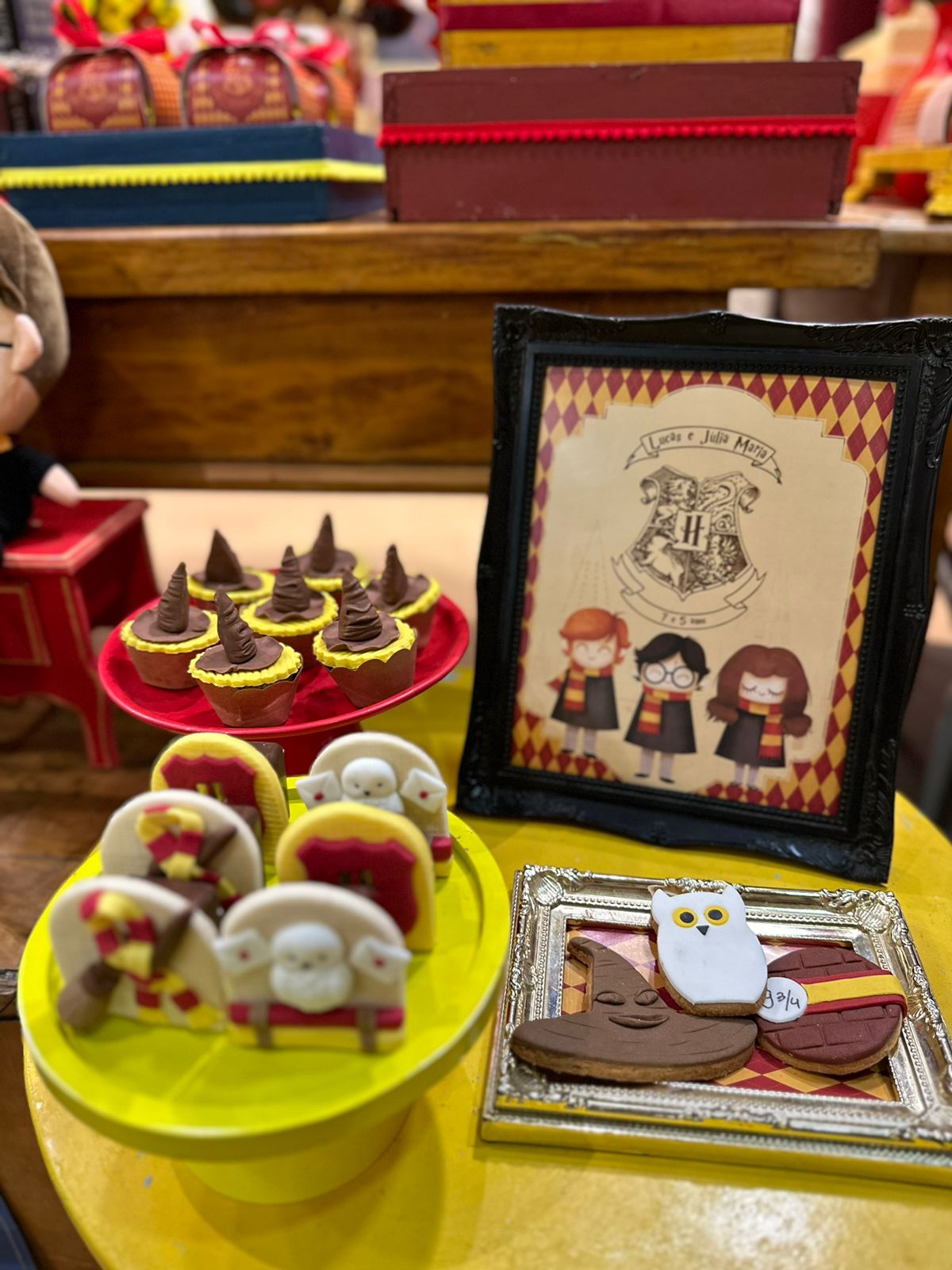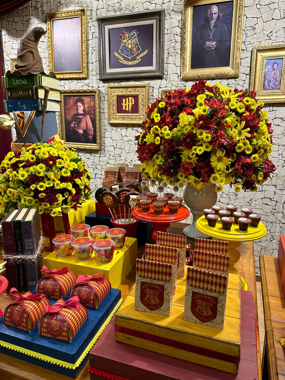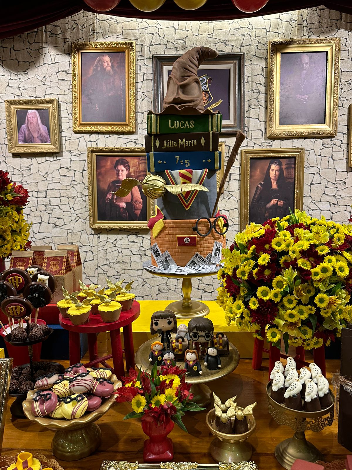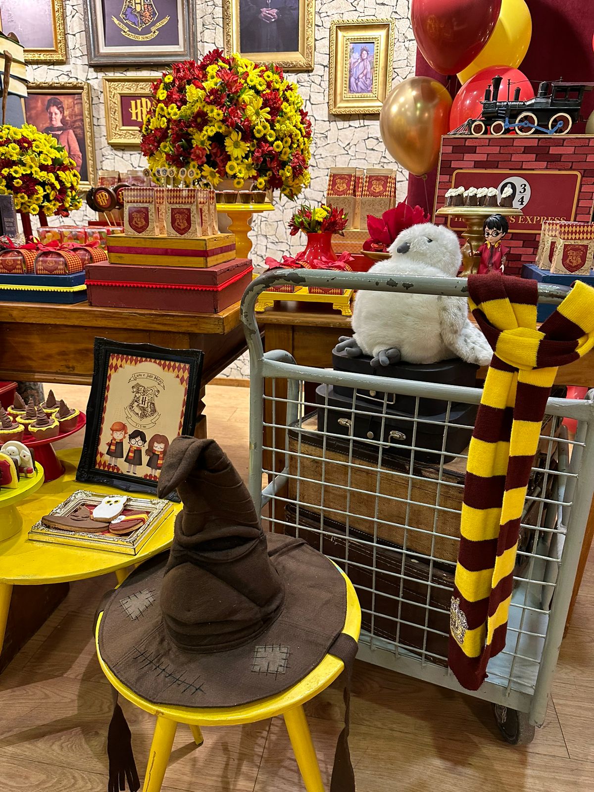 O tema Harry Potter transporta todos para o mágico universo de Hogwarts, repleto de aventura e mistério. A decoração recria o ambiente icônico do castelo, com detalhes que vão desde os chapéus seletores, varinhas até as casas de Gryffindor, Slytherin, Ravenclaw e Hufflepuff. As cores escuras, como o preto e o dourado, dão o toque mágico e elegante, fazendo os convidados se sentirem parte de uma verdadeira história de bruxos. Ideal para quem quer uma festa imersiva e cheia de encantamento!