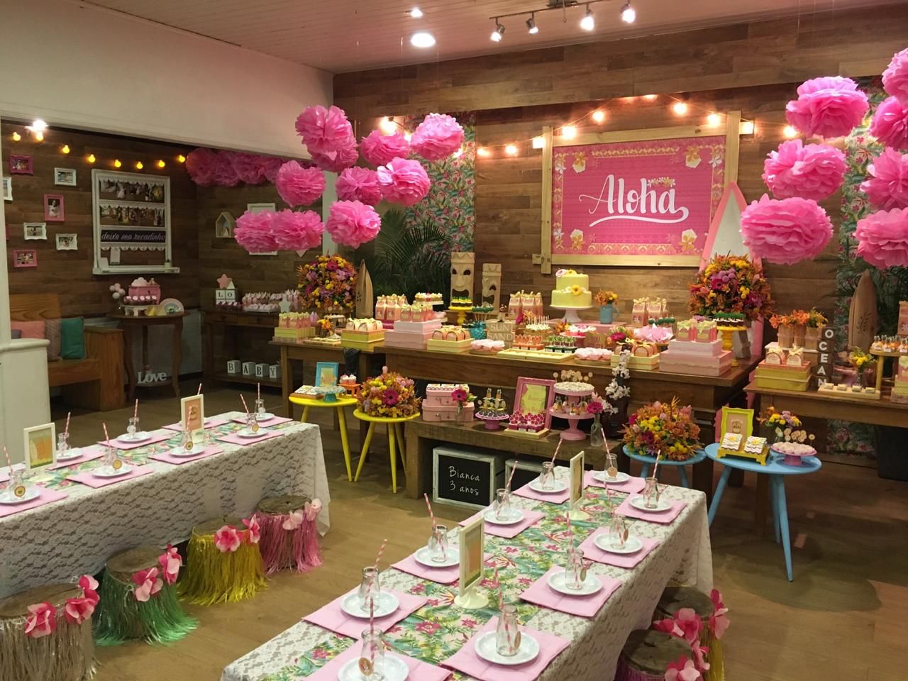 Bem-Vindos ao nosso Luau: Onde a Alegria Brilha como o Sol! O espaço será transformado em uma praia paradisíaca, com uma explosão de cores em tons de rosa e amarelo que lembram o pôr do sol e a areia dourada. Os balões sanfonados pendentes darão um toque especial de festividade, enquanto as pranchas, palmeiras e saiotes cintilantes criarão uma atmosfera de pura diversão tropical.