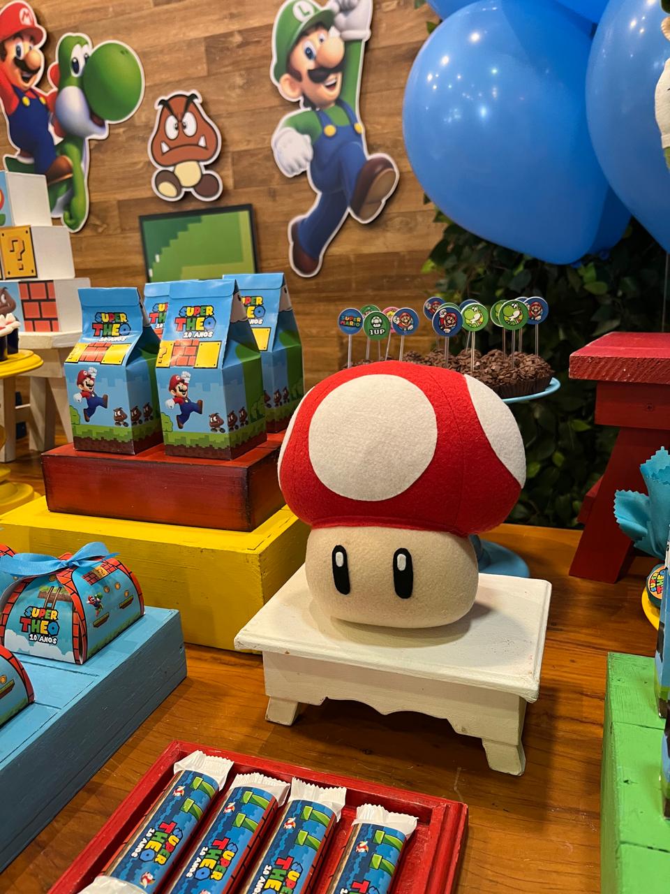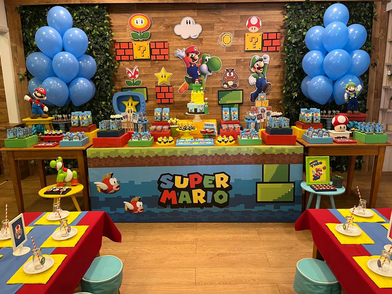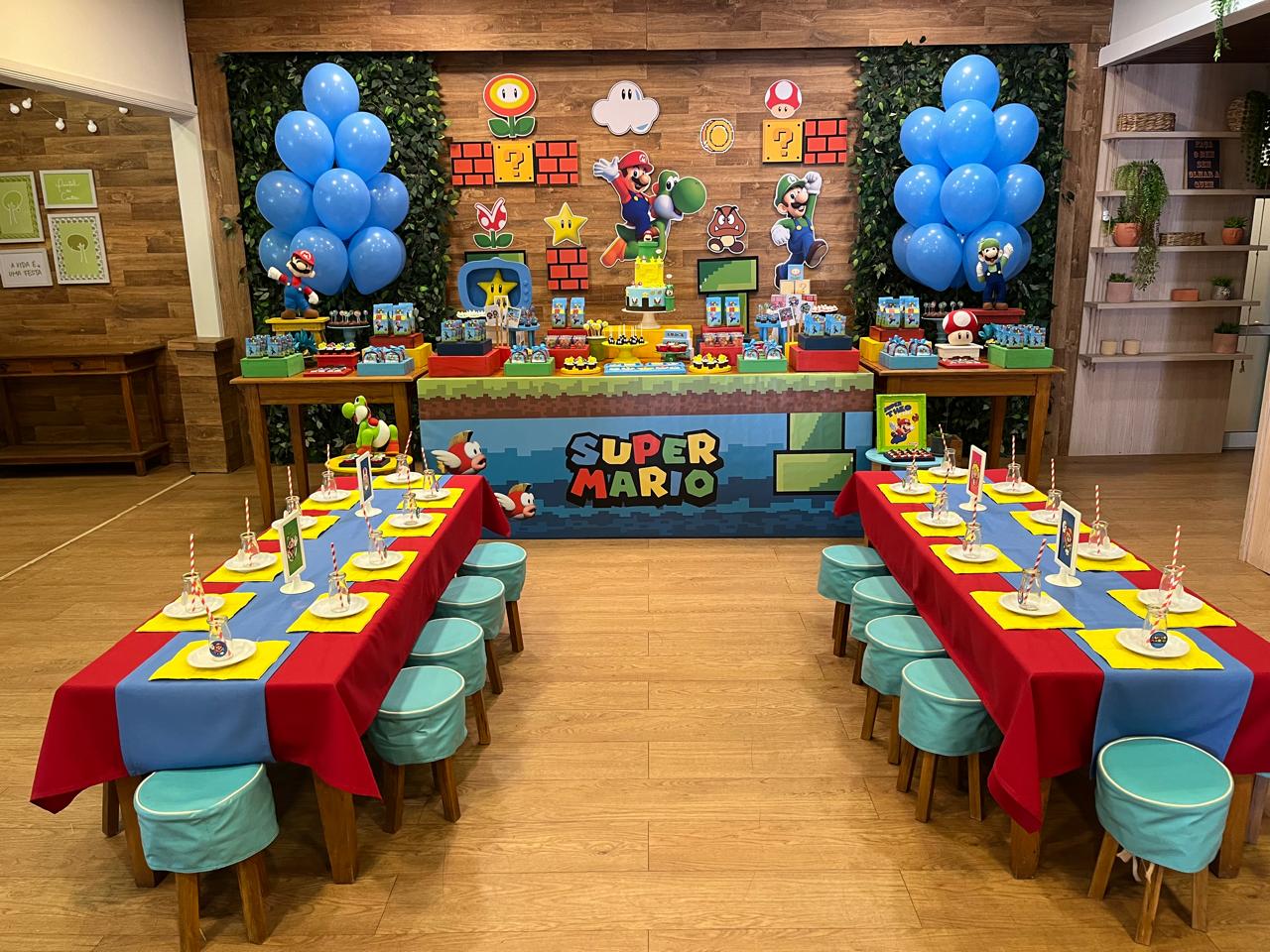 Nesta festa incrível inspirada no famoso jogo de videogame, a decoração remeterá a um cenário que lembra os icônicos níveis do jogo Super Mario Bros, com elementos decorativos que remetem aos personagens, cenários e itens favoritos dos fãs. Desde os famosos cogumelos até as famosas moedas douradas, cada detalhe evocará a atmosfera única do universo do Super Mario.