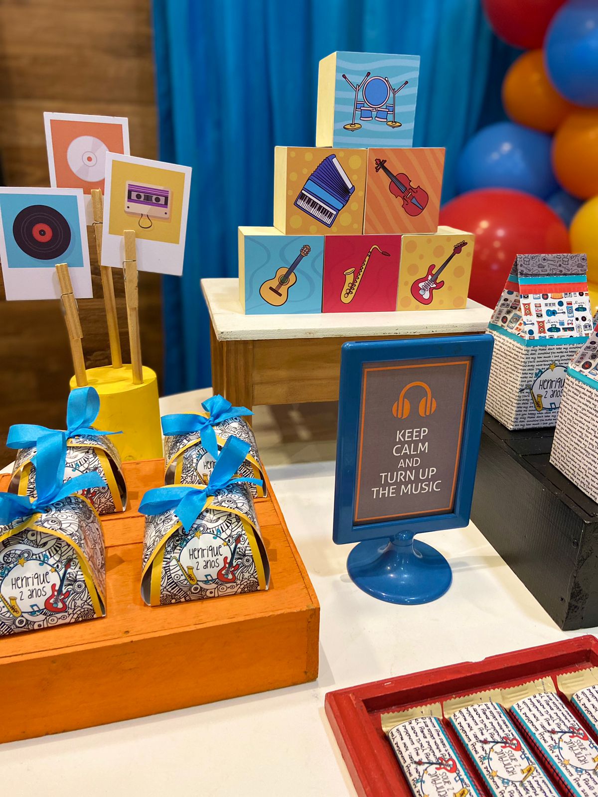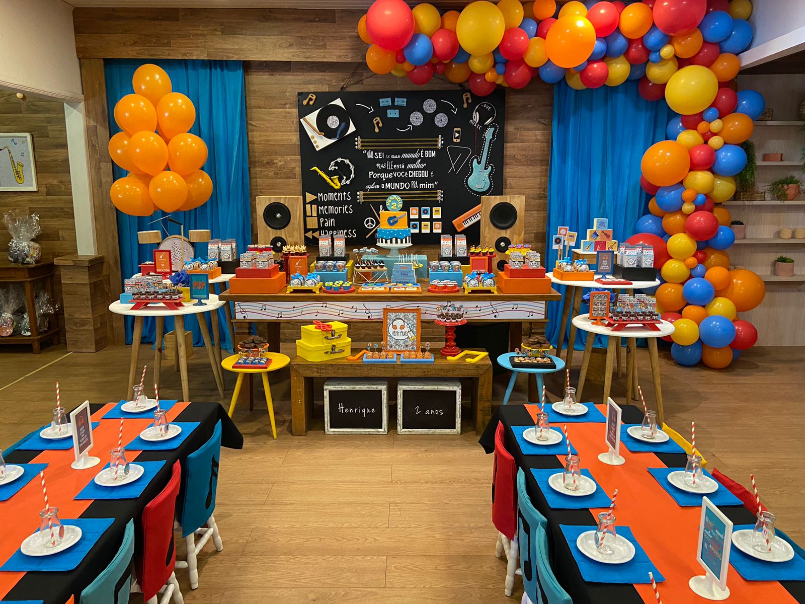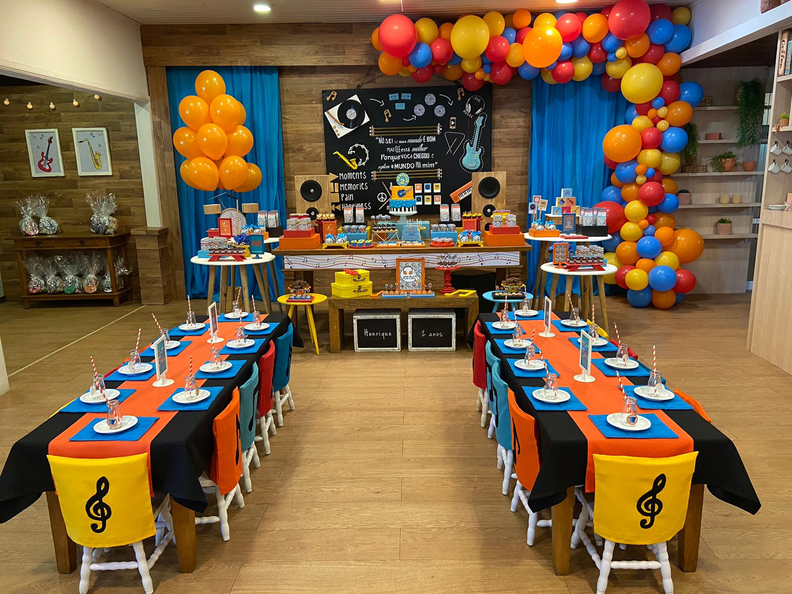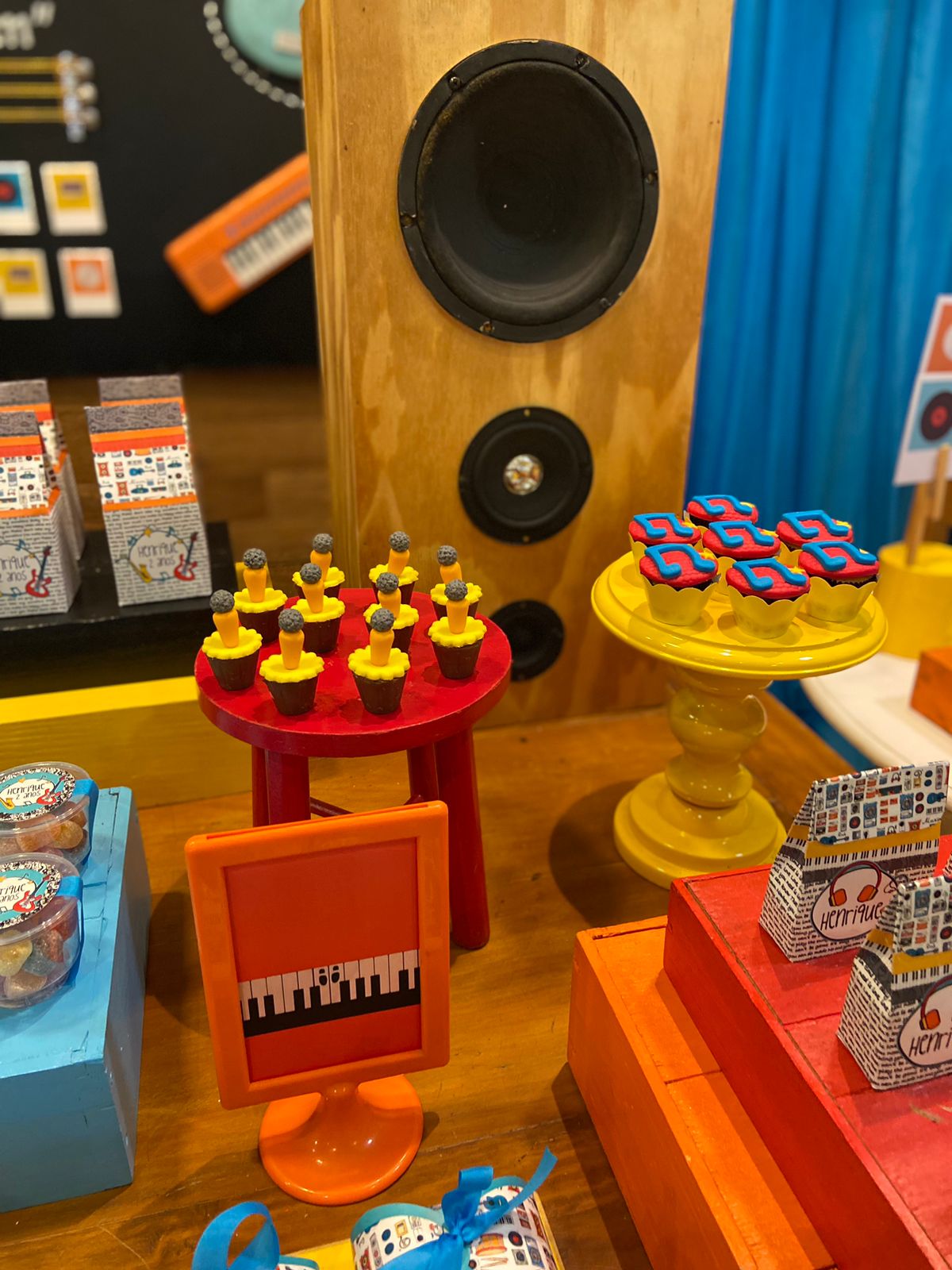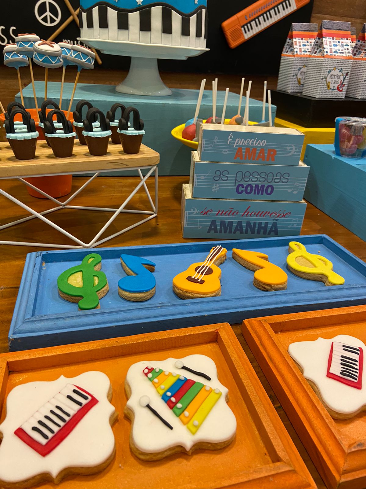 Desde os primórdios da humanidade, a música tem sido uma parte essencial de nossas vidas, trazendo alegria, emoção e conexão entre as pessoas. Cores amarelo, laranja e azul irão enfeitar o ambiente, representando a energia e a alegria da música.Os docinhos da mesa principal serão verdadeiras obras de arte com tema musical! Cupcakes decorados em formato de notas musicais, instrumentos musicais e fones de ouvido serão destaque, adicionando um toque de doçura e criatividade à festa.