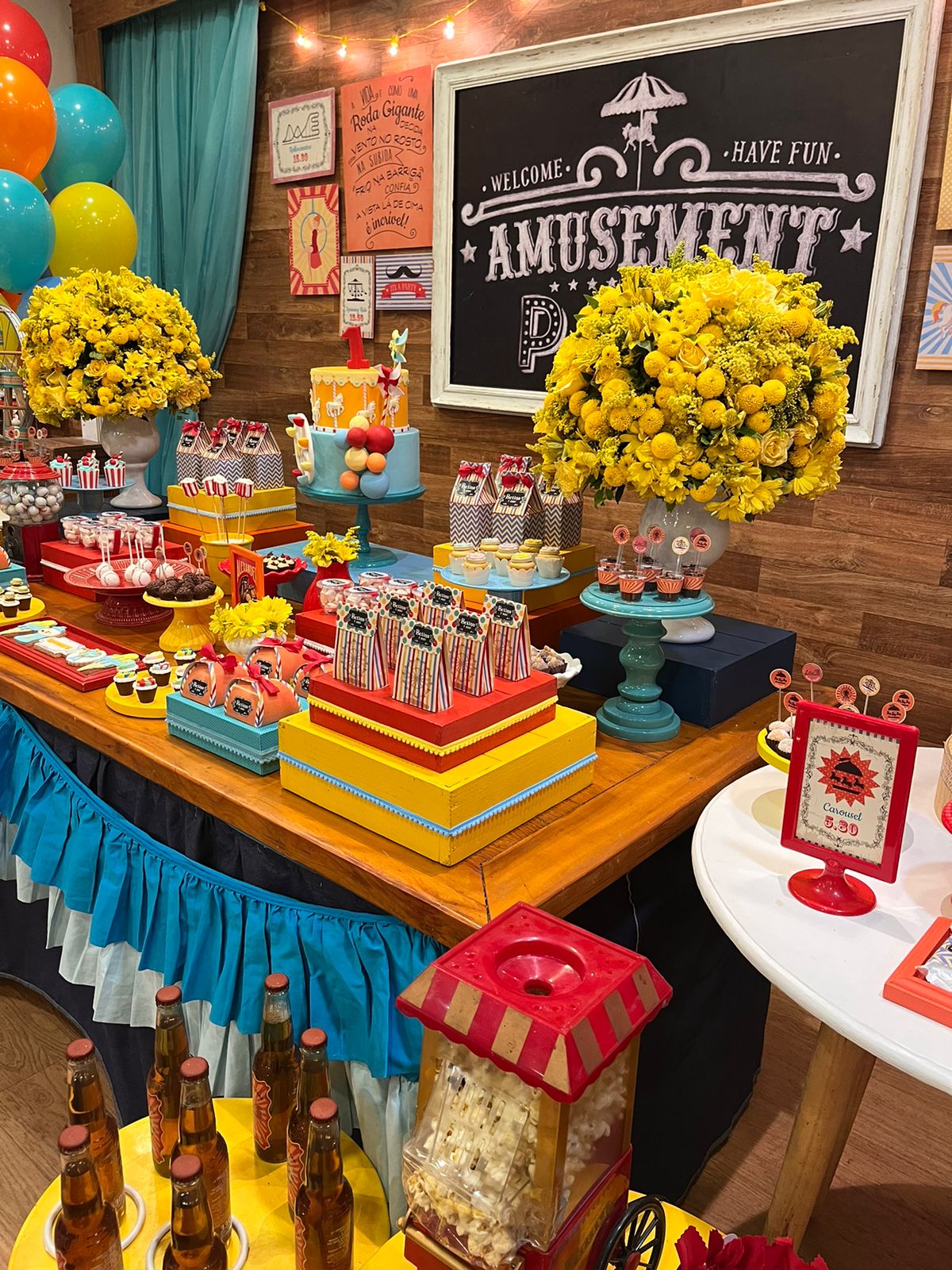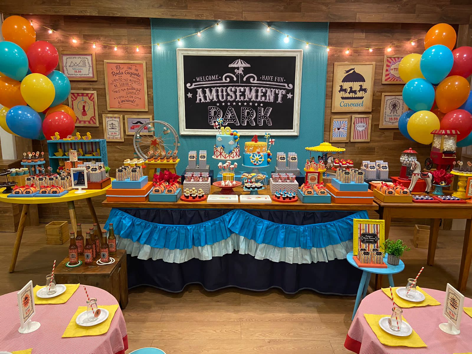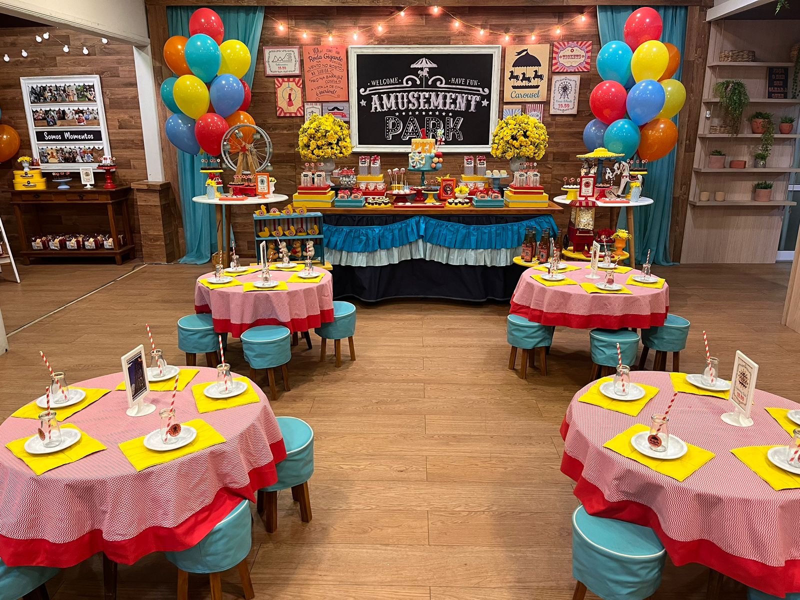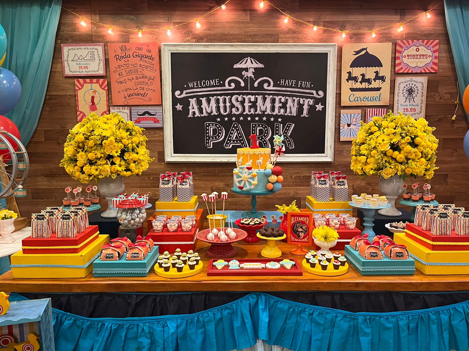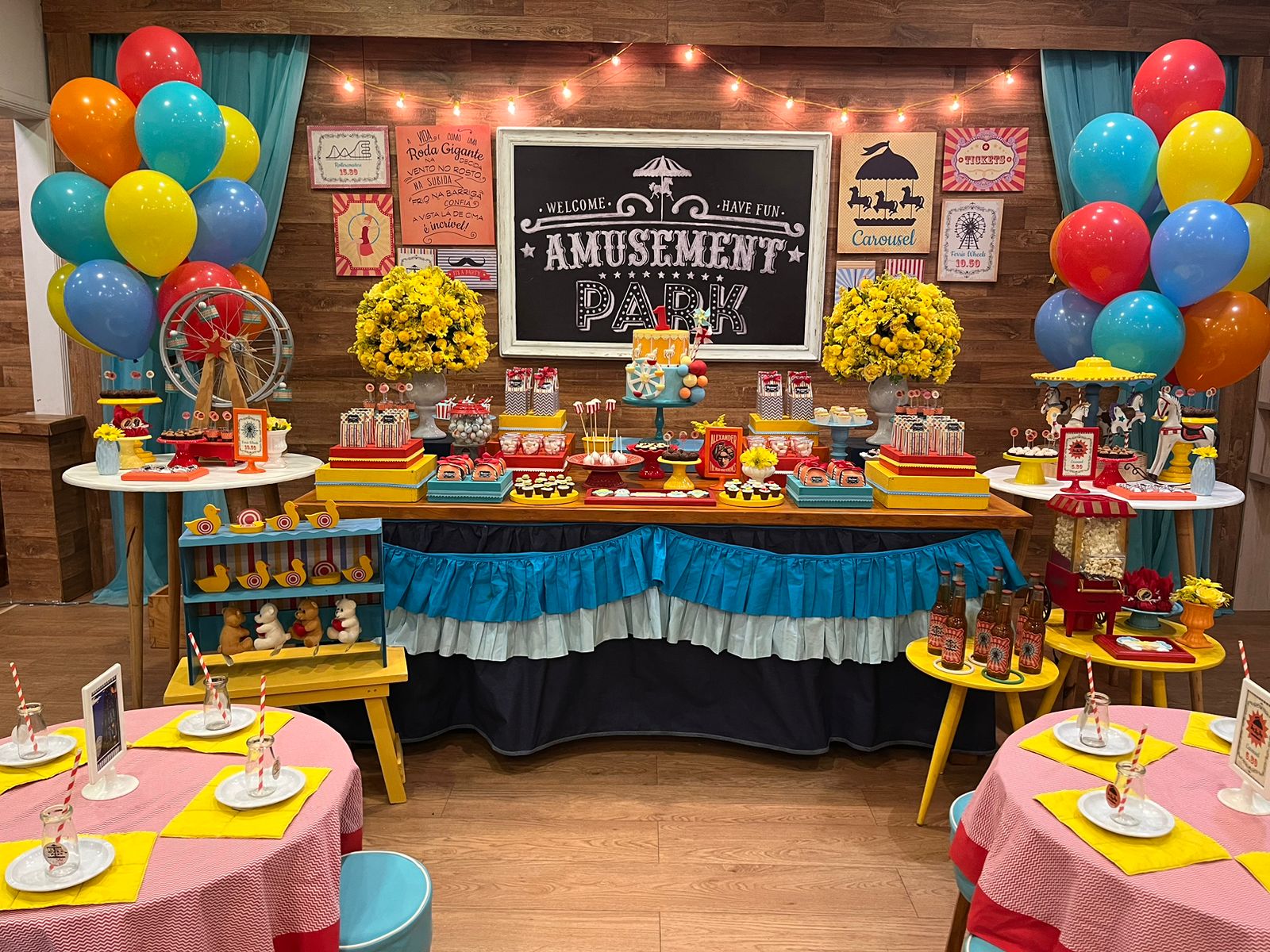 Os parques de diversões têm sido uma fonte de diversão para crianças e adultos por gerações, oferecendo uma variedade de atrações emocionantes. A decoração da festa refletirá essa atmosfera festiva com uma explosão de cores vibrantes, incluindo balões, faixas e bandeiras coloridas. Elementos decorativos inspirados nas brincadeiras e atrações dos parques, como alvos de tiro ao pato, ursinhos de pelúcia, milkshakes listrados e réplicas de carrosséis e rodas-gigantes, completam a cena, proporcionando uma experiência de diversão e fantasia.