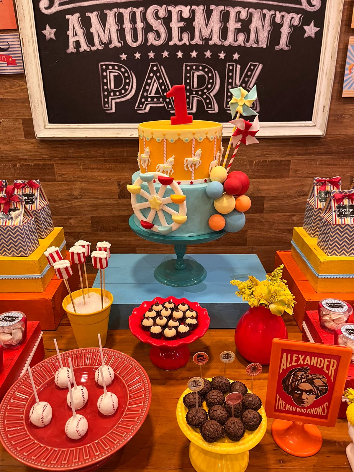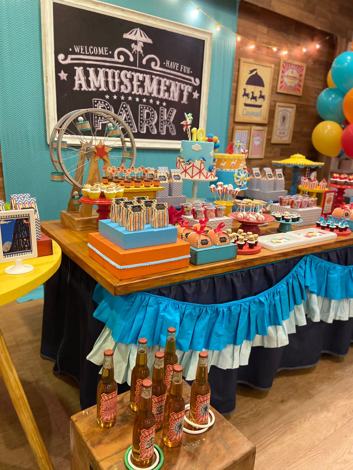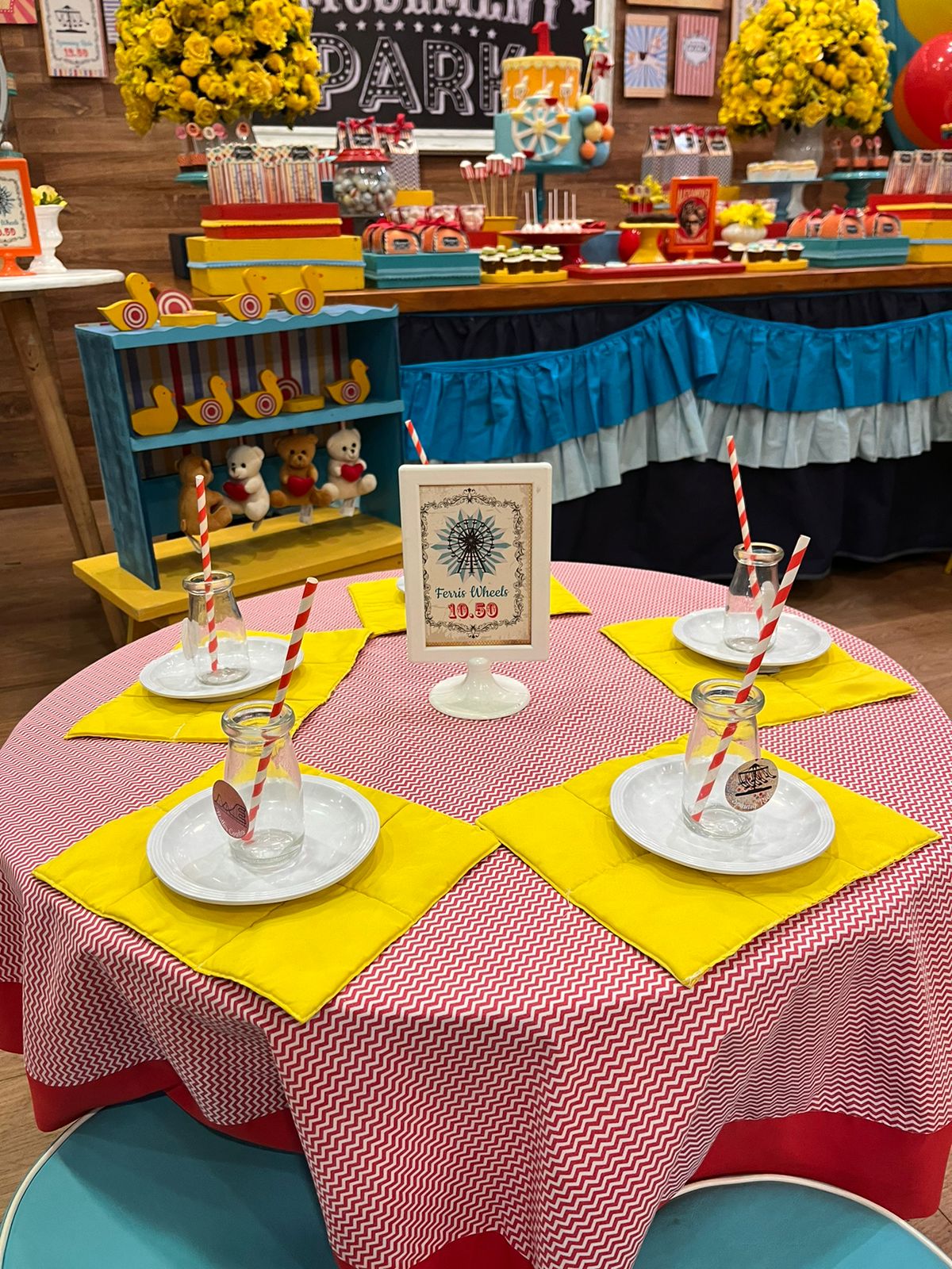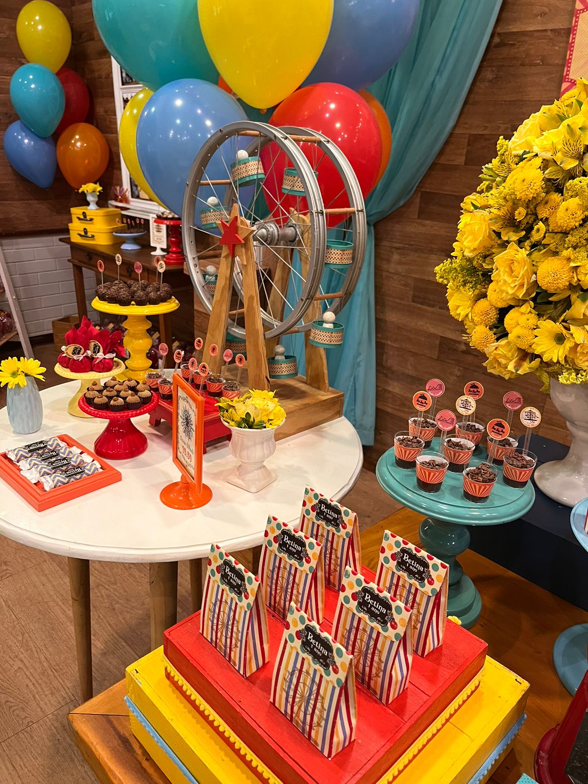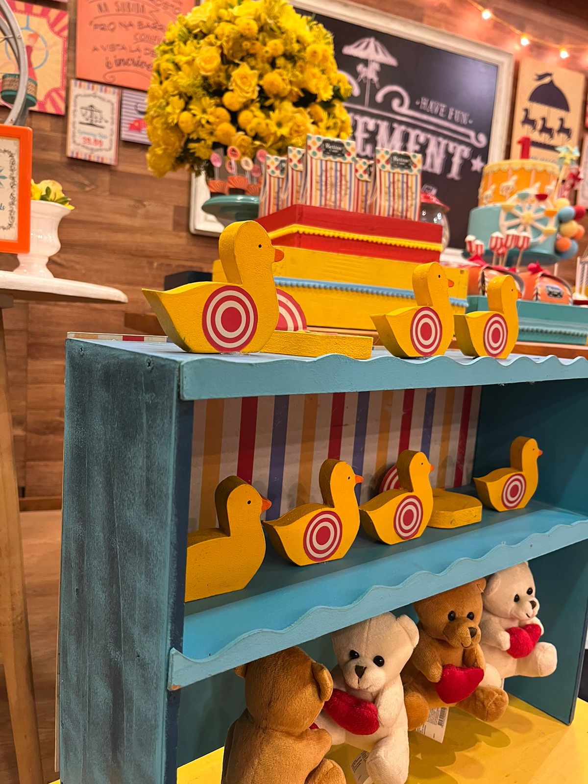 Os parques de diversões têm sido uma fonte de diversão para crianças e adultos por gerações, oferecendo uma variedade de atrações emocionantes. A decoração da festa refletirá essa atmosfera festiva com uma explosão de cores vibrantes, incluindo balões, faixas e bandeiras coloridas. Elementos decorativos inspirados nas brincadeiras e atrações dos parques, como alvos de tiro ao pato, ursinhos de pelúcia, milkshakes listrados e réplicas de carrosséis e rodas-gigantes, completam a cena, proporcionando uma experiência de diversão e fantasia.