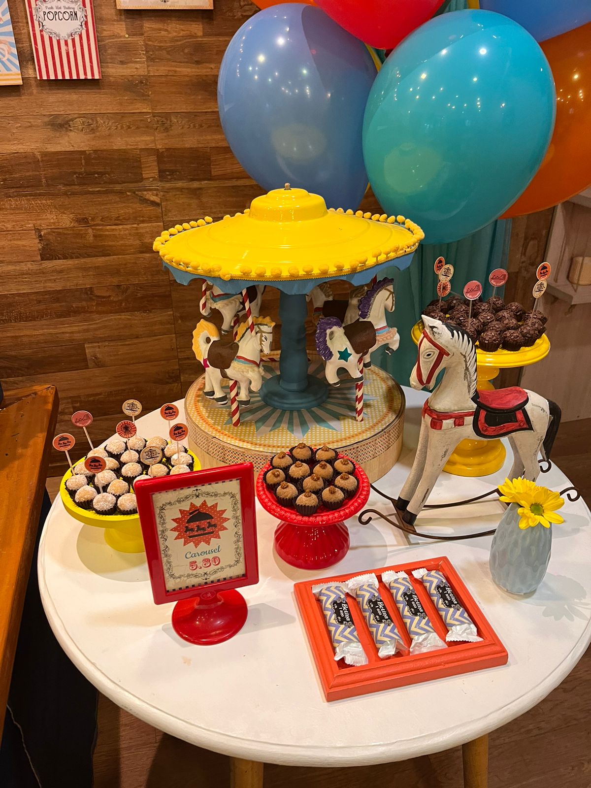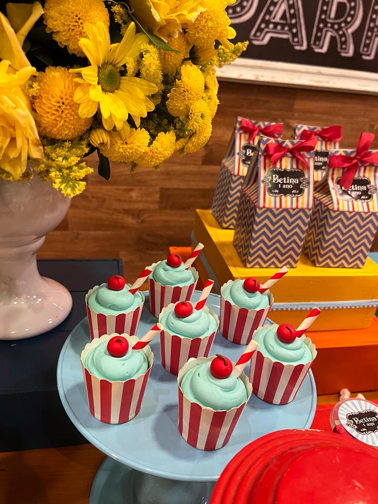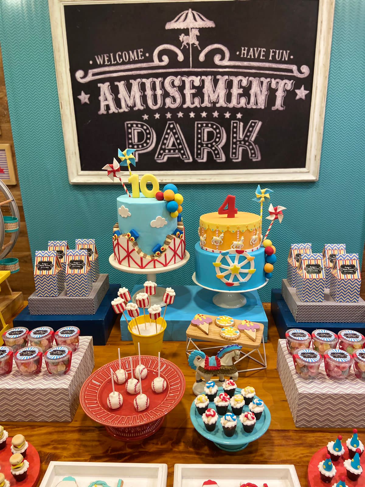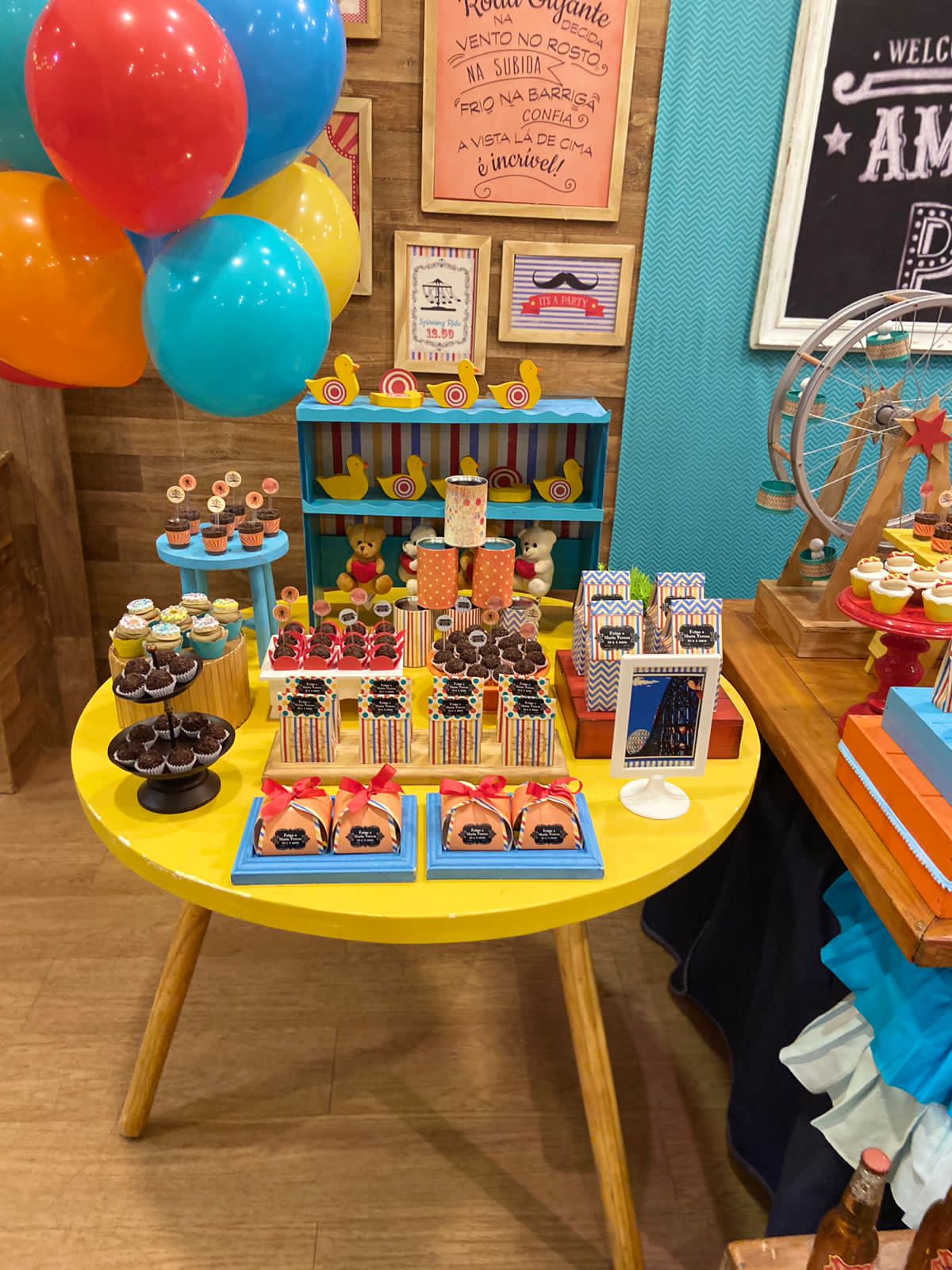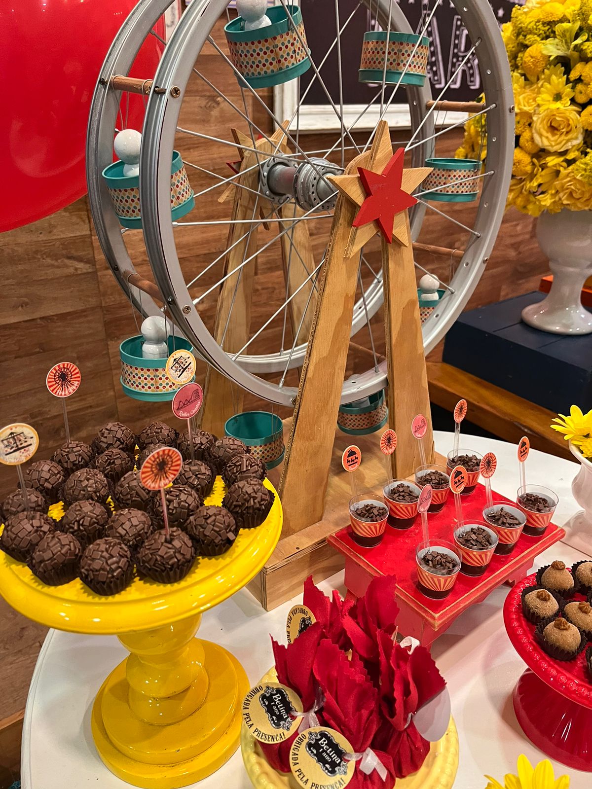 Os parques de diversões têm sido uma fonte de diversão para crianças e adultos por gerações, oferecendo uma variedade de atrações emocionantes. A decoração da festa refletirá essa atmosfera festiva com uma explosão de cores vibrantes, incluindo balões, faixas e bandeiras coloridas. Elementos decorativos inspirados nas brincadeiras e atrações dos parques, como alvos de tiro ao pato, ursinhos de pelúcia, milkshakes listrados e réplicas de carrosséis e rodas-gigantes, completam a cena, proporcionando uma experiência de diversão e fantasia.