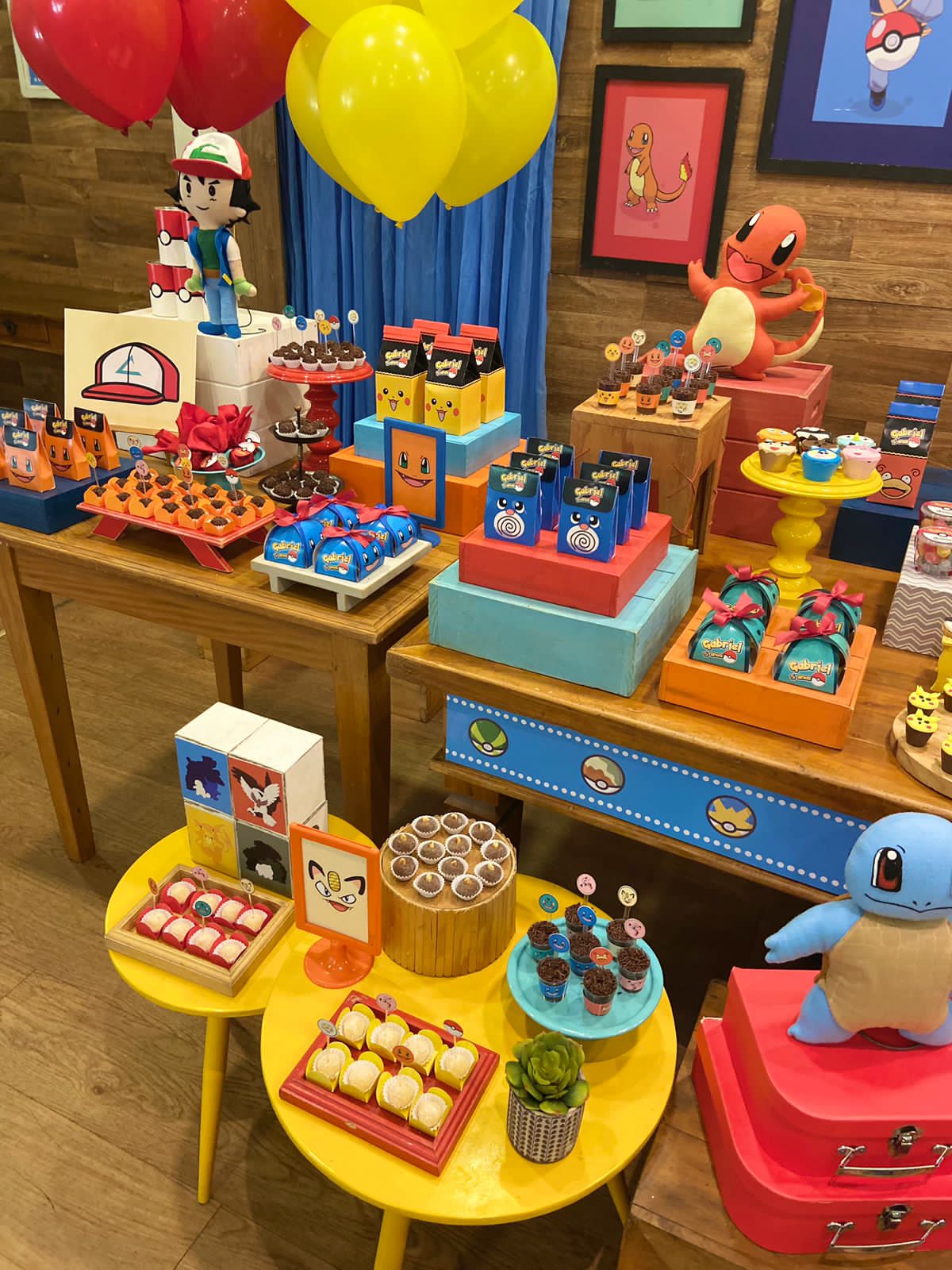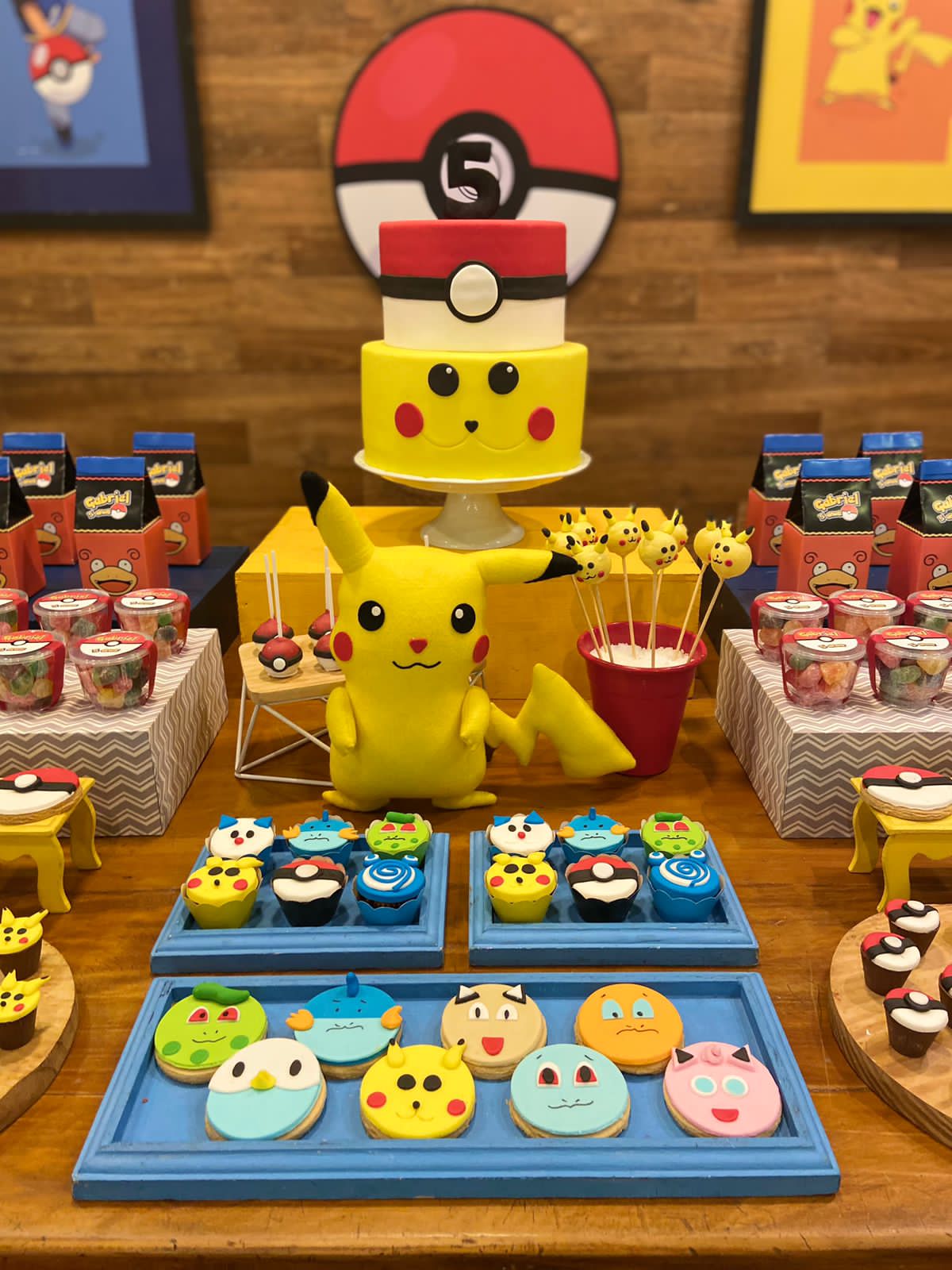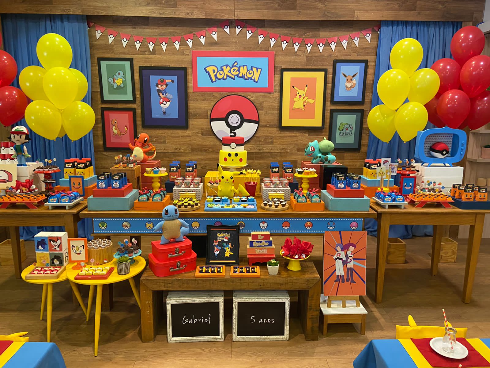 Os Pokémon são criaturas mágicas que habitam um mundo vasto e cheio de mistérios conhecido como Pokémon World.Com uma ampla variedade de tipos e habilidades, os Pokémon são verdadeiros companheiros de seus treinadores em suas jornadas para se tornarem os melhores mestres Pokémon. Nessa decoração, as cores principais serão o branco, amarelo e vermelho. Na mesa, teremos cupcakes decorados com os rostos dos Pokémon e brigadeiros com bolinhas coloridas inspiradas nos Pokébolas, para que cada foto e cada momento compartilhado se transformem em lembranças mágicas desta celebração festiva e cheia de Pokémon!