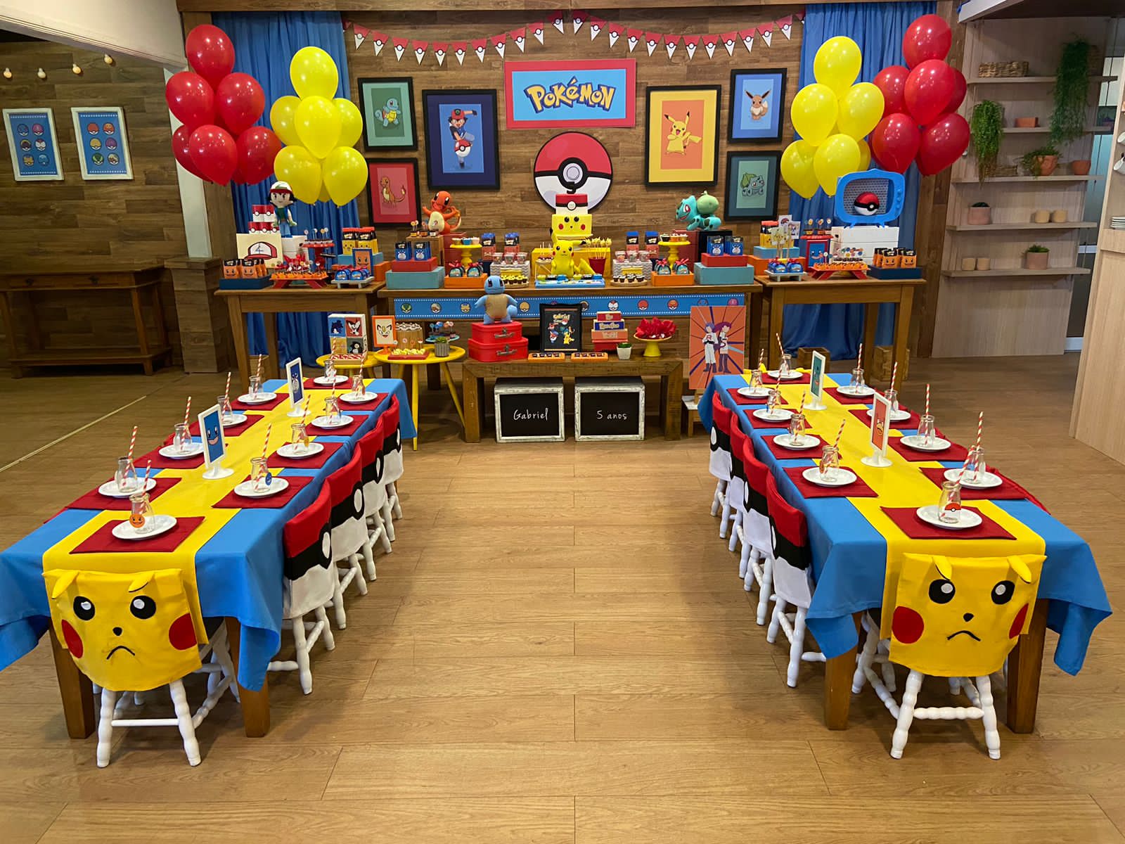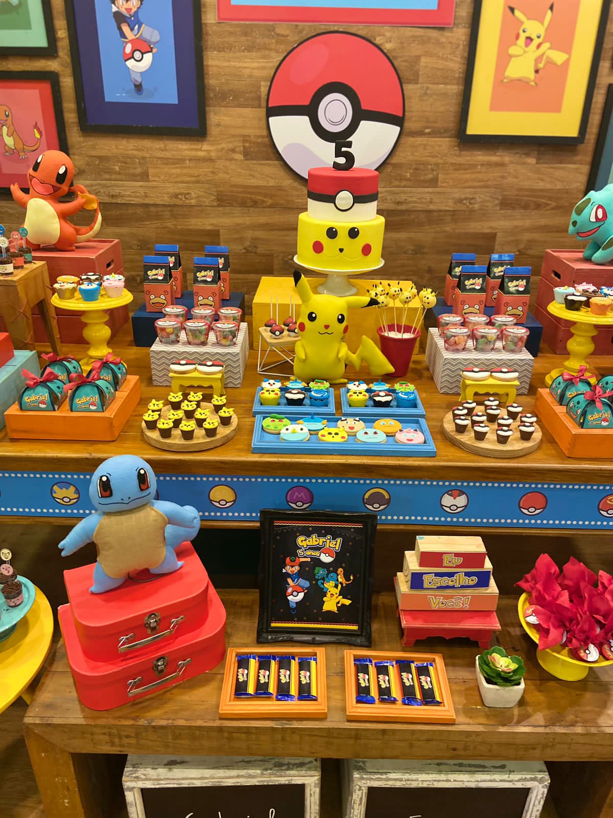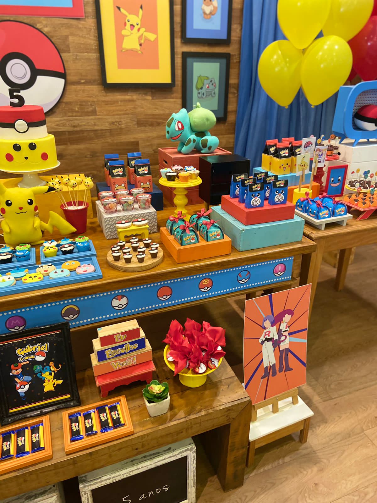 Os Pokémon são criaturas mágicas que habitam um mundo vasto e cheio de mistérios conhecido como Pokémon World.Com uma ampla variedade de tipos e habilidades, os Pokémon são verdadeiros companheiros de seus treinadores em suas jornadas para se tornarem os melhores mestres Pokémon. Nessa decoração, as cores principais serão o branco, amarelo e vermelho. Na mesa, teremos cupcakes decorados com os rostos dos Pokémon e brigadeiros com bolinhas coloridas inspiradas nos Pokébolas, para que cada foto e cada momento compartilhado se transformem em lembranças mágicas desta celebração festiva e cheia de Pokémon!