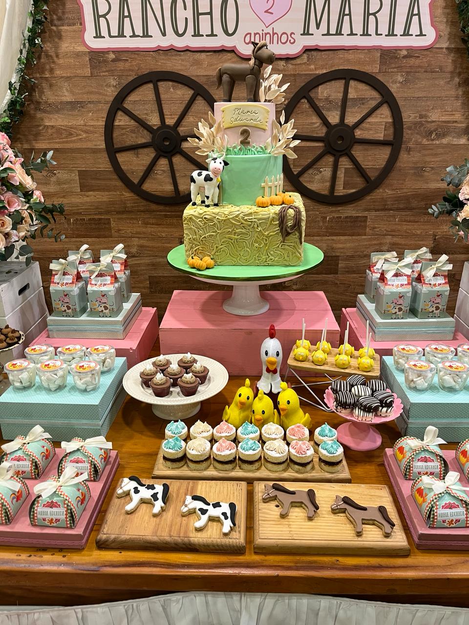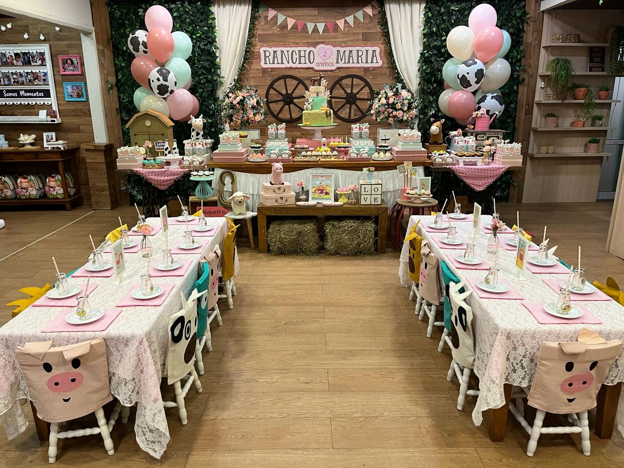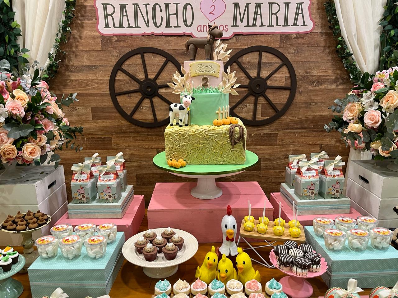 Na decoração desta festa, vamos nos transportar para o clima descontraído e rústico de uma autêntica fazenda. Teremos elementos como feno e rodas de carroça que criarão uma atmosfera genuína de rancho. Não poderiam faltar os adoráveis bichinhos que habitam as fazendas, como galinhas, porcos e vacas, que estarão presentes nas cadeirinhas.