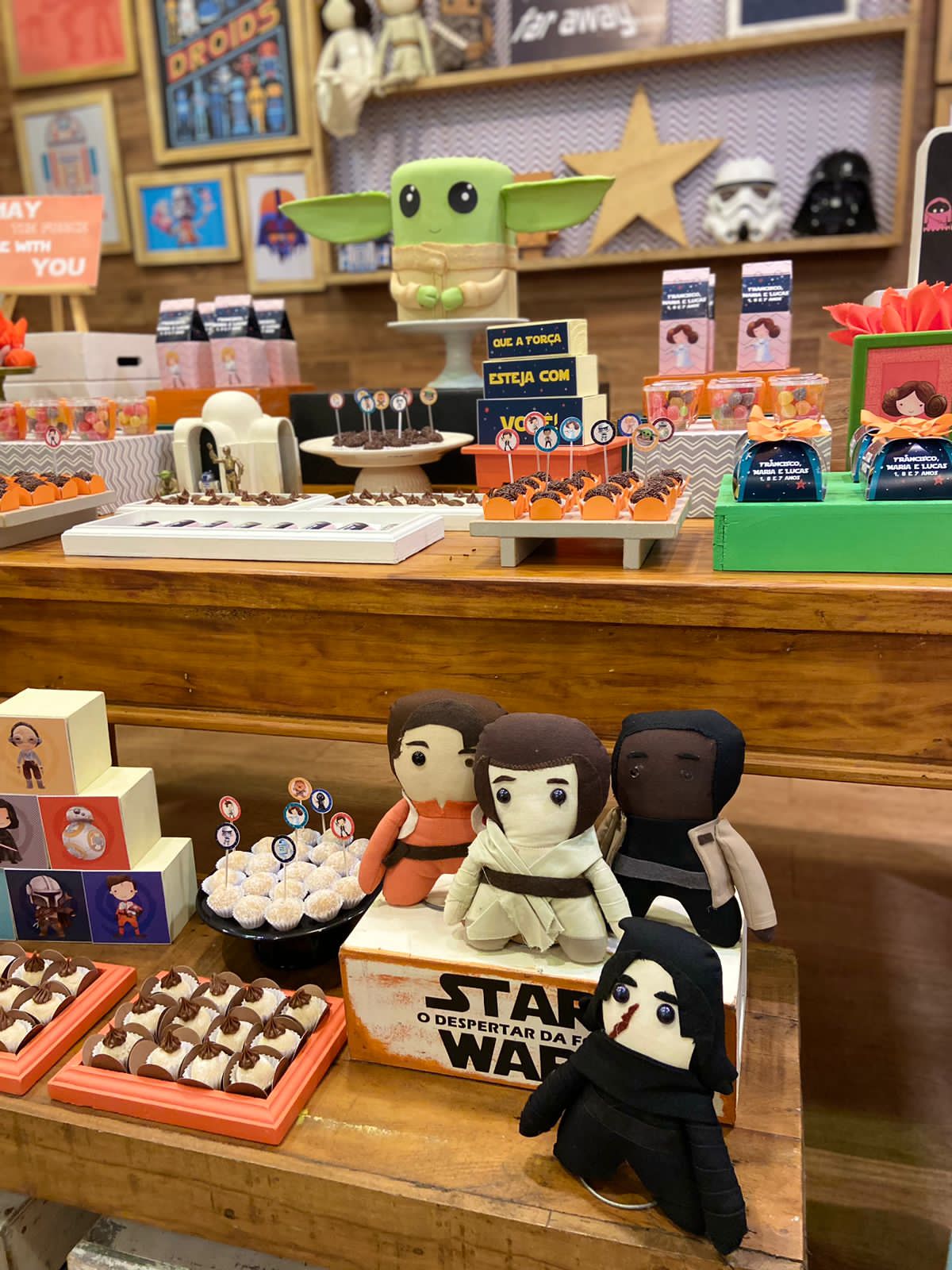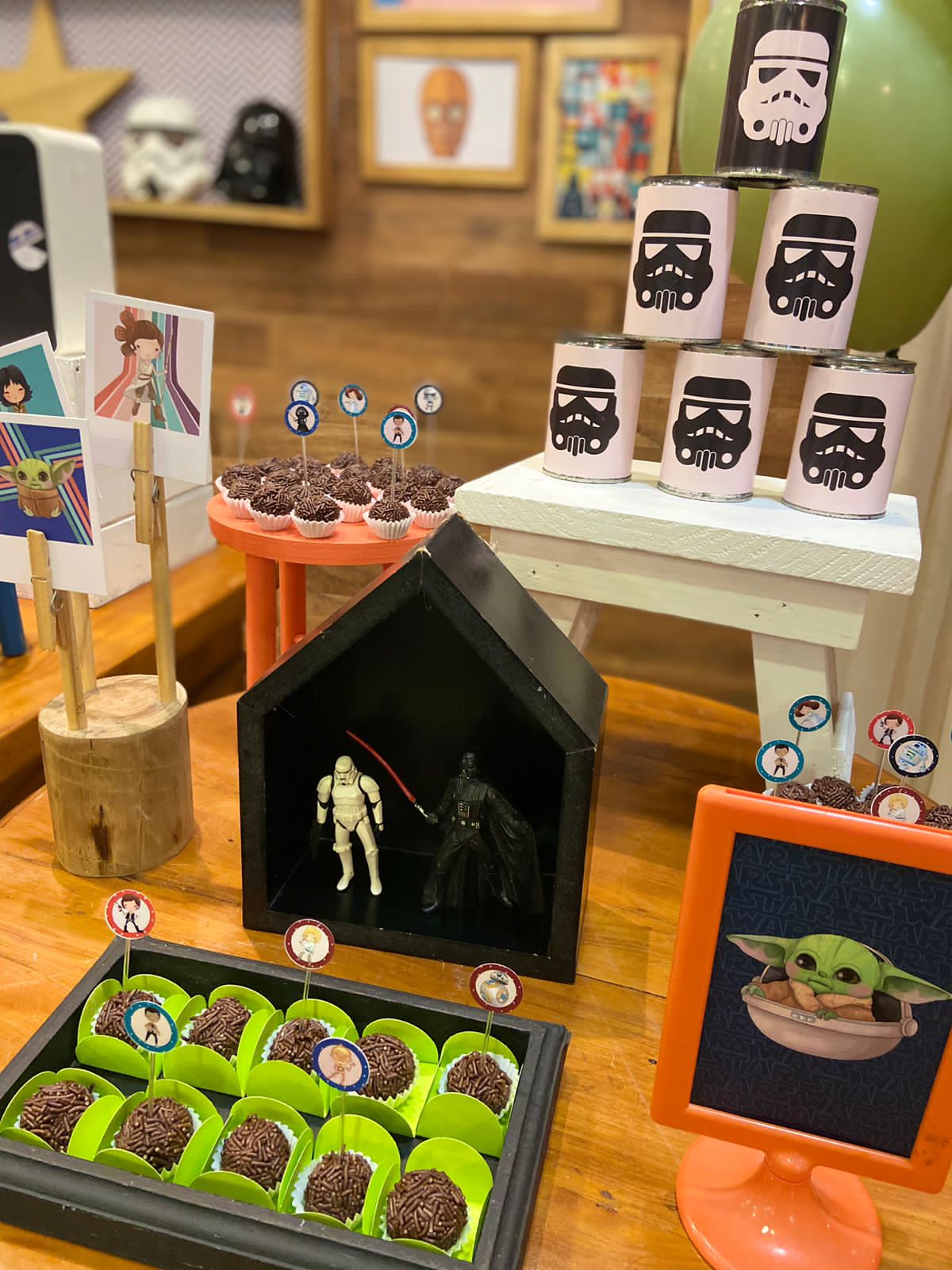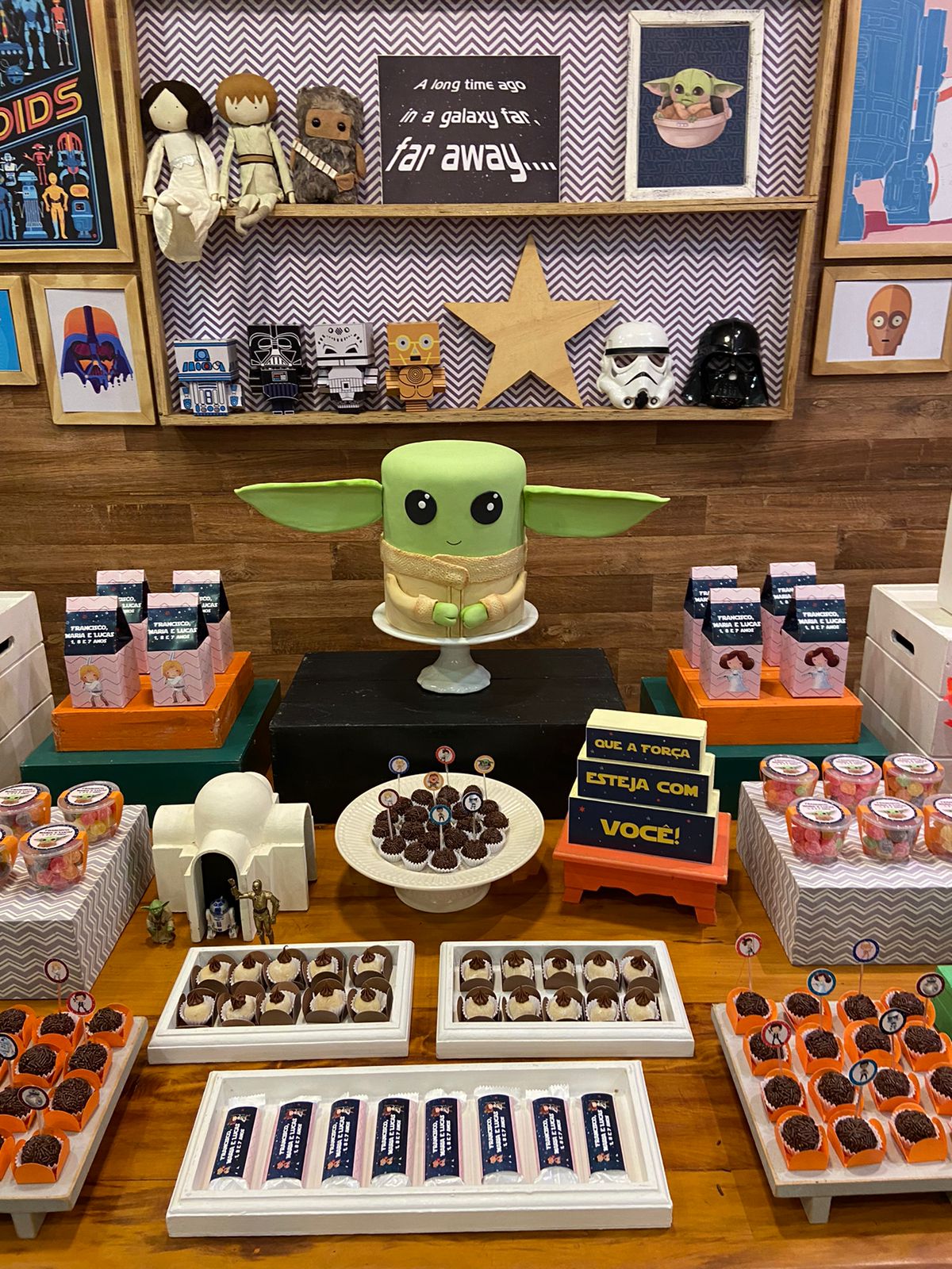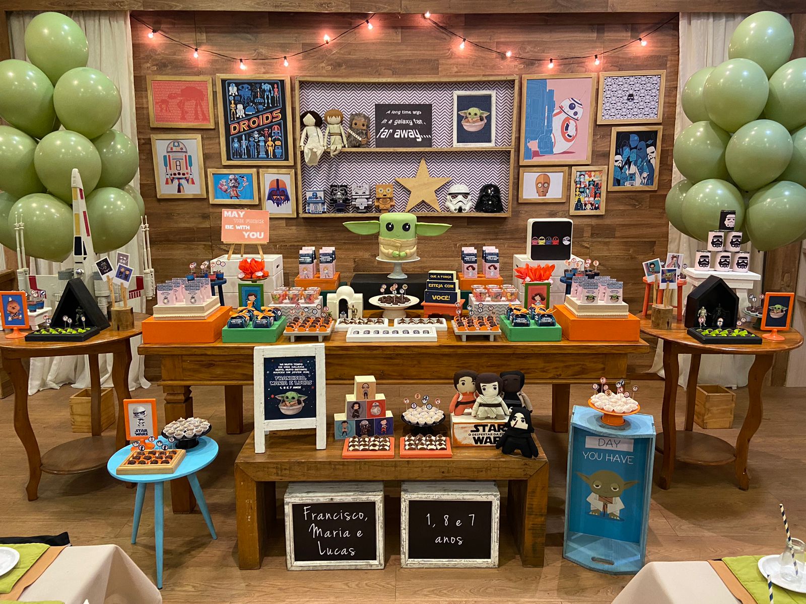 O Baby Yoda, também conhecido como Grogu, conquistou o coração dos fãs de Star Wars com sua fofura e mistério. Este pequeno ser verde, da mesma raça do famoso Mestre Yoda, é um personagem adorável e enigmático que se tornou um ícone da franquia. Para a festa inspirada no Baby Yoda, a decoração será centrada nas cores características do personagem, com destaque para o verde. Esta cor irá dominar o ambiente, trazendo a essência do universo de Star Wars para a festa de forma encantadora e cativante.