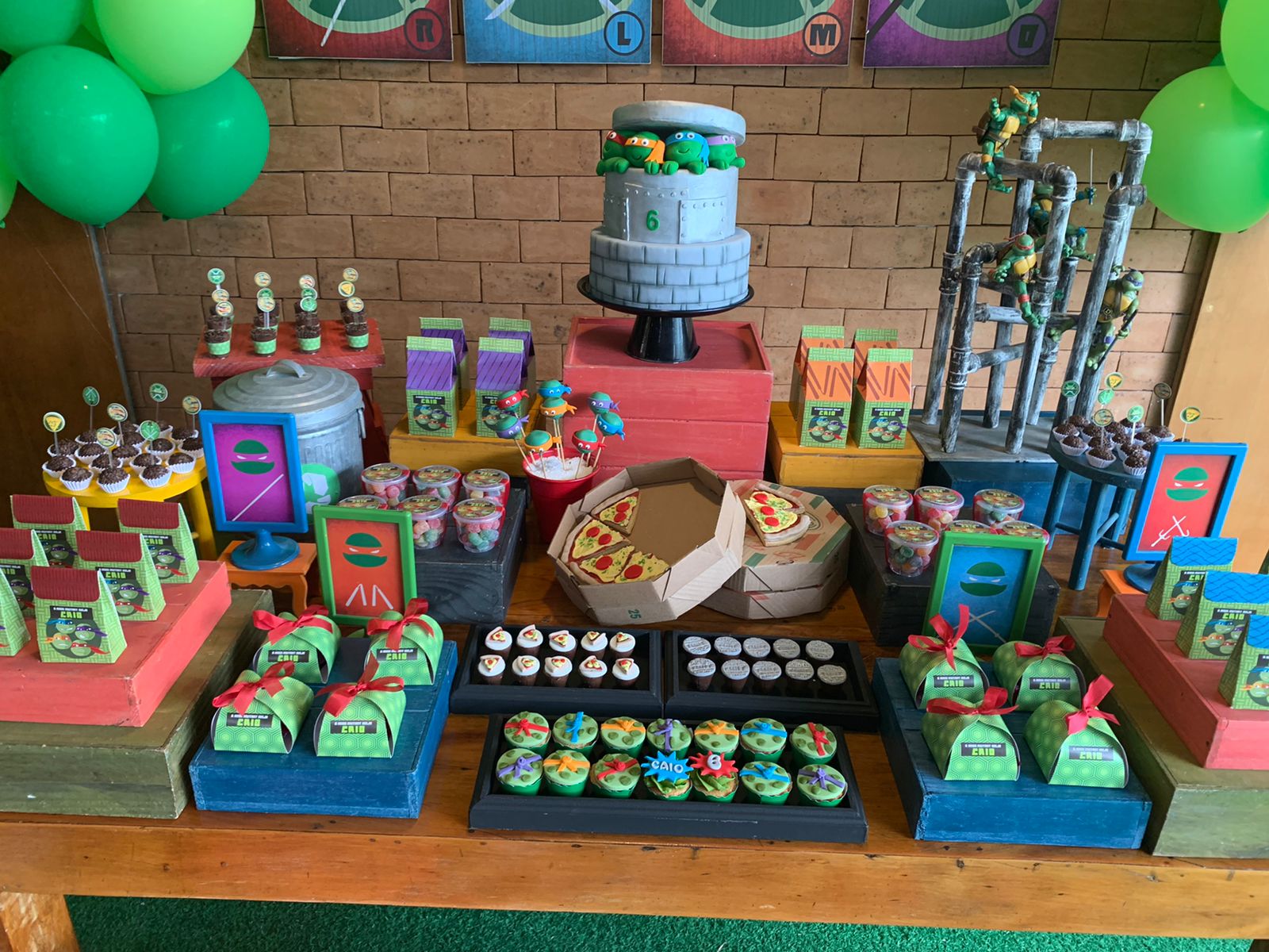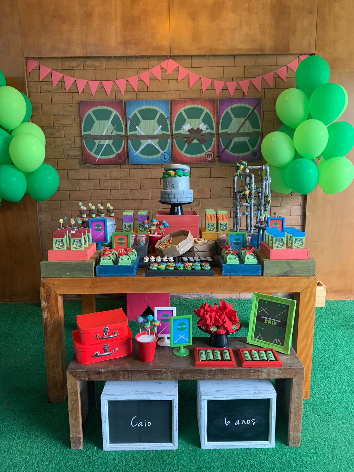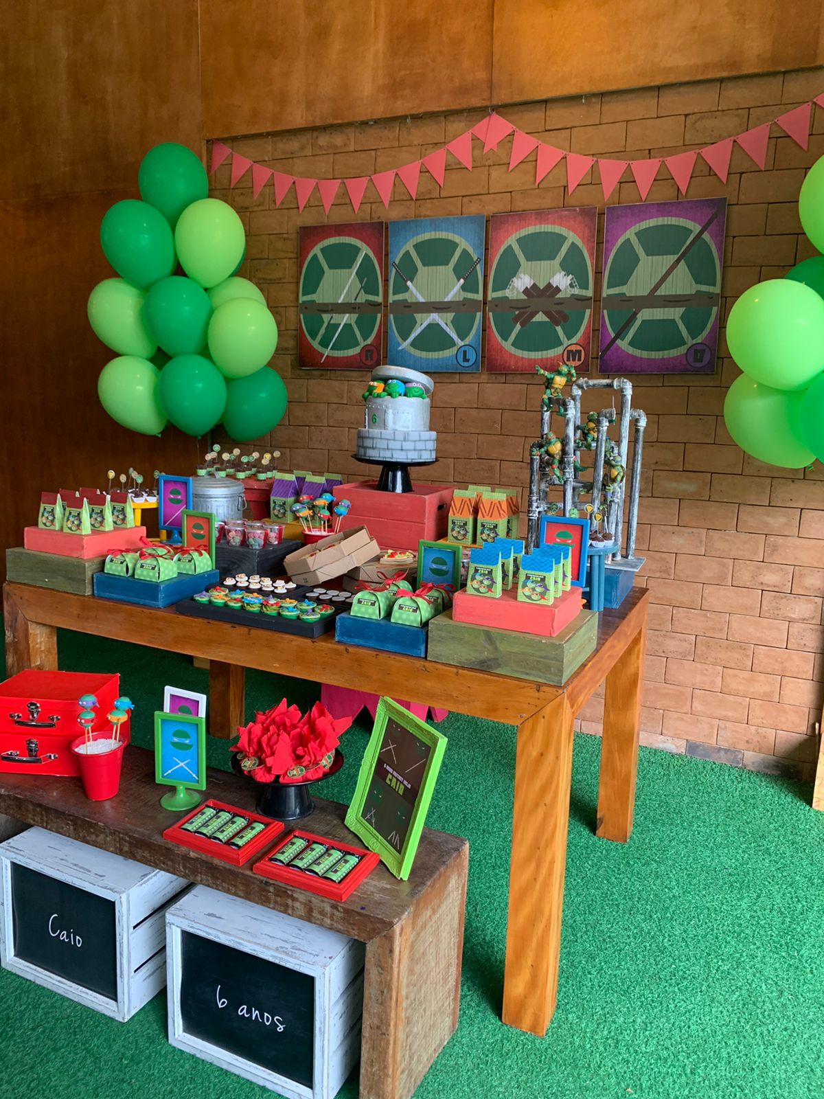 As Tartarugas Ninja, Leonardo, Michelangelo, Donatello e Raphael, são heróis lendários das ruas de Nova York, conhecidos por sua coragem, habilidades ninja e amor por pizza. Para a festa inspirada nas Tartarugas Ninja, a decoração será repleta de elementos característicos dos personagens. Canos de esgoto, que lembram o lar subterrâneo das tartarugas, estarão presentes, criando uma atmosfera urbana e autêntica. Além disso, as pizzas, a comida favorita das tartarugas, serão o destaque da mesa principal, com variedades de sabores para todos os gostos.Os quatro irmãos ninja serão representados em painéis decorativos e itens de festa, garantindo que cada detalhe remeta ao universo das Tartarugas Ninja.