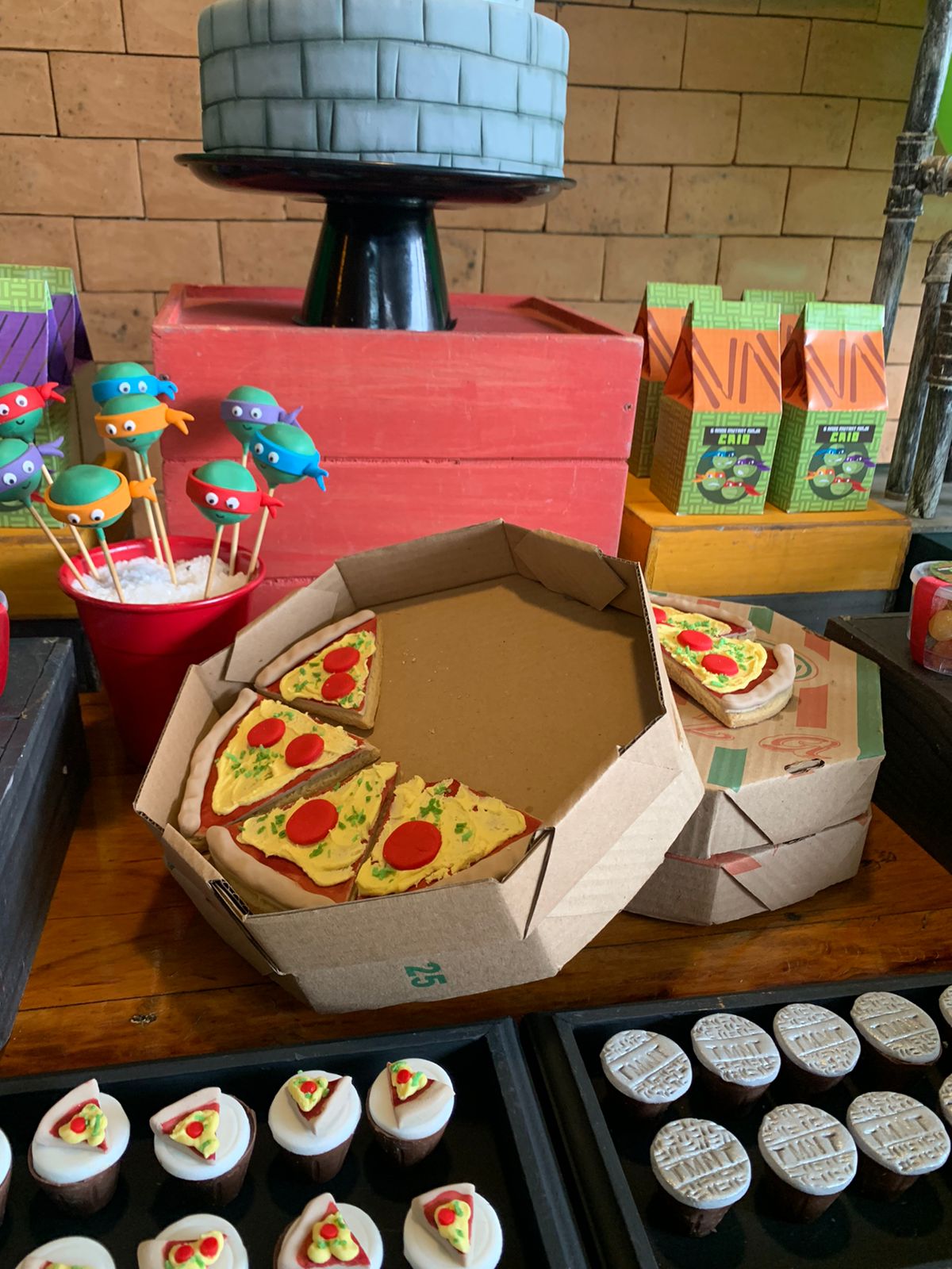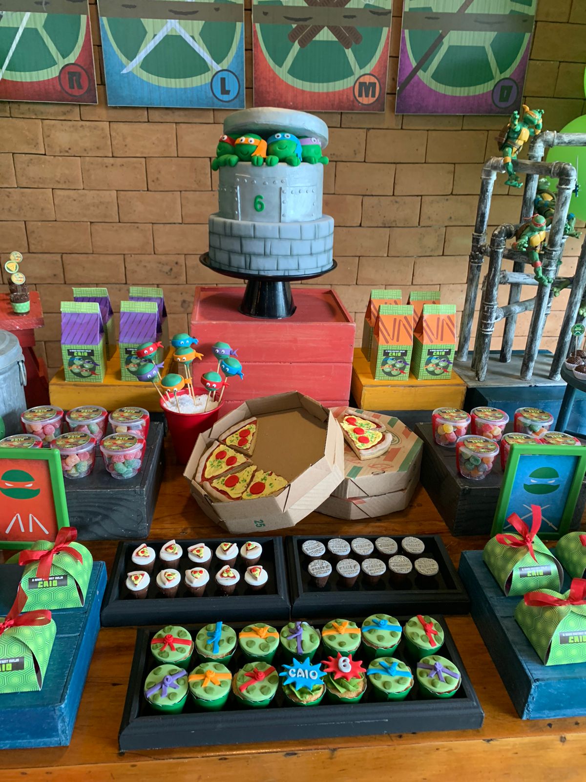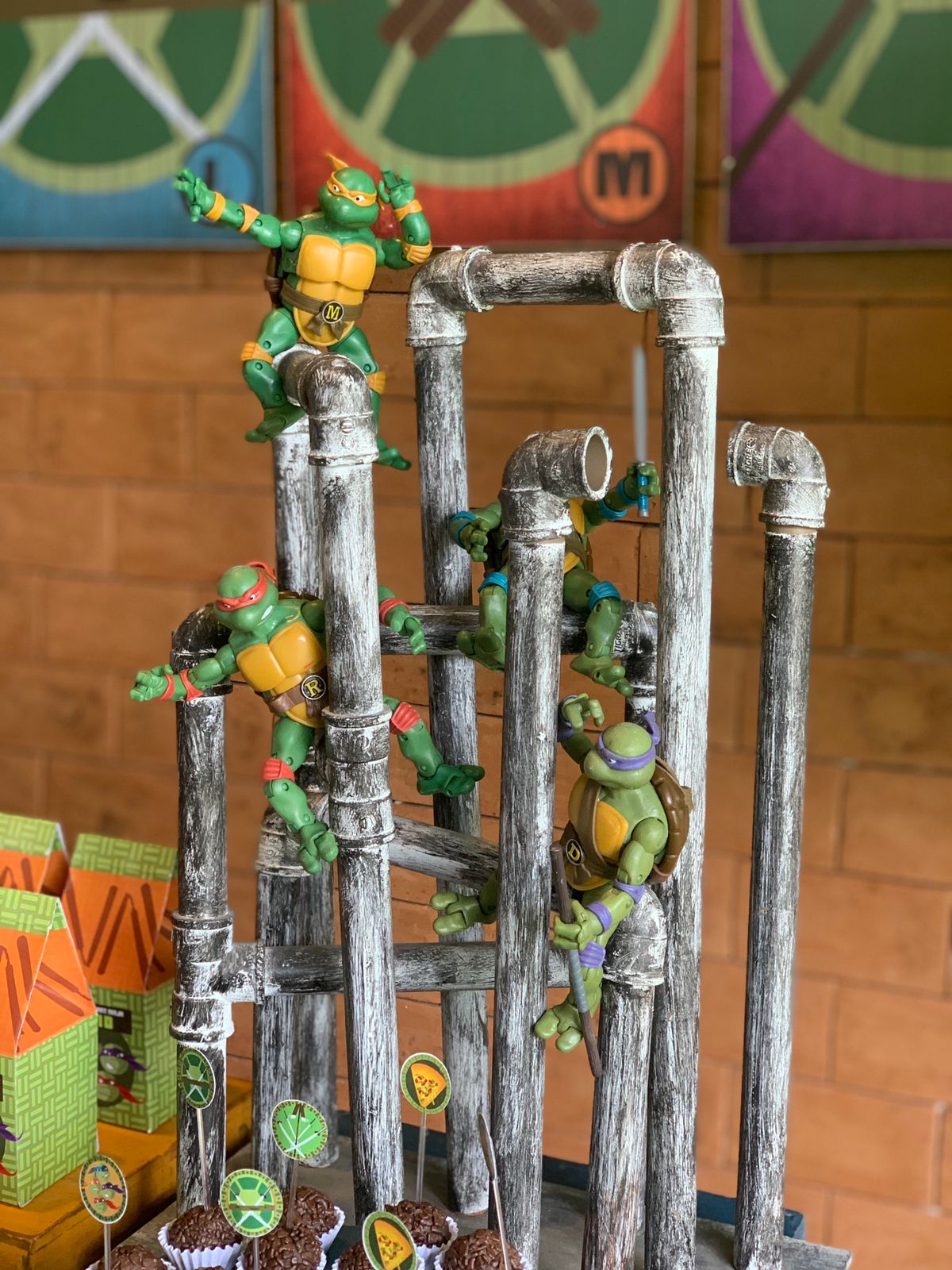 As Tartarugas Ninja, Leonardo, Michelangelo, Donatello e Raphael, são heróis lendários das ruas de Nova York, conhecidos por sua coragem, habilidades ninja e amor por pizza. Para a festa inspirada nas Tartarugas Ninja, a decoração será repleta de elementos característicos dos personagens. Canos de esgoto, que lembram o lar subterrâneo das tartarugas, estarão presentes, criando uma atmosfera urbana e autêntica. Além disso, as pizzas, a comida favorita das tartarugas, serão o destaque da mesa principal, com variedades de sabores para todos os gostos.Os quatro irmãos ninja serão representados em painéis decorativos e itens de festa, garantindo que cada detalhe remeta ao universo das Tartarugas Ninja.