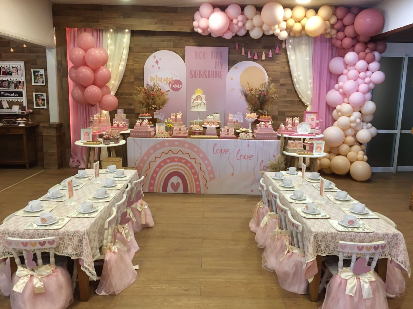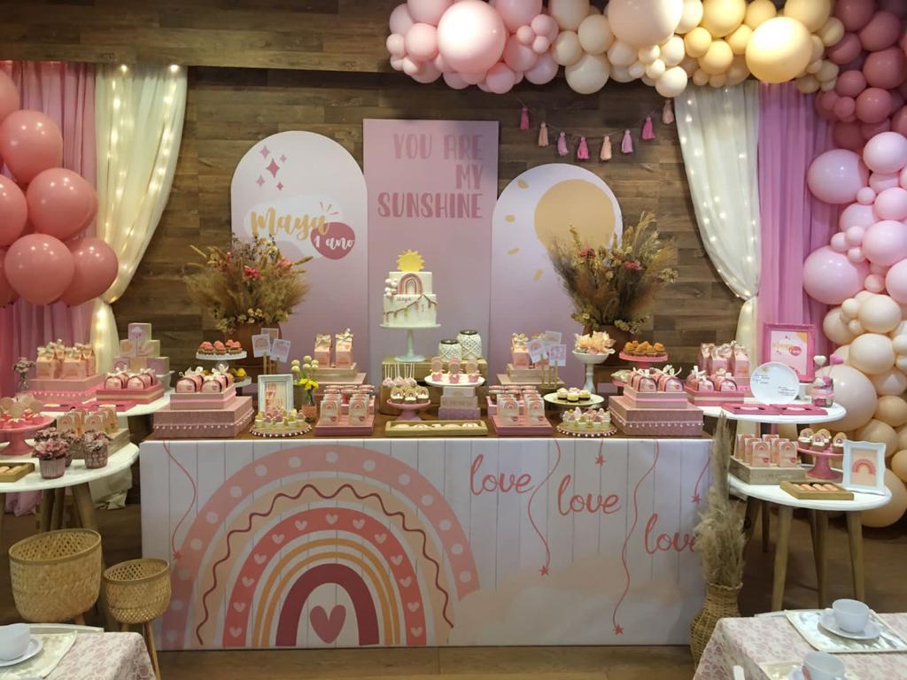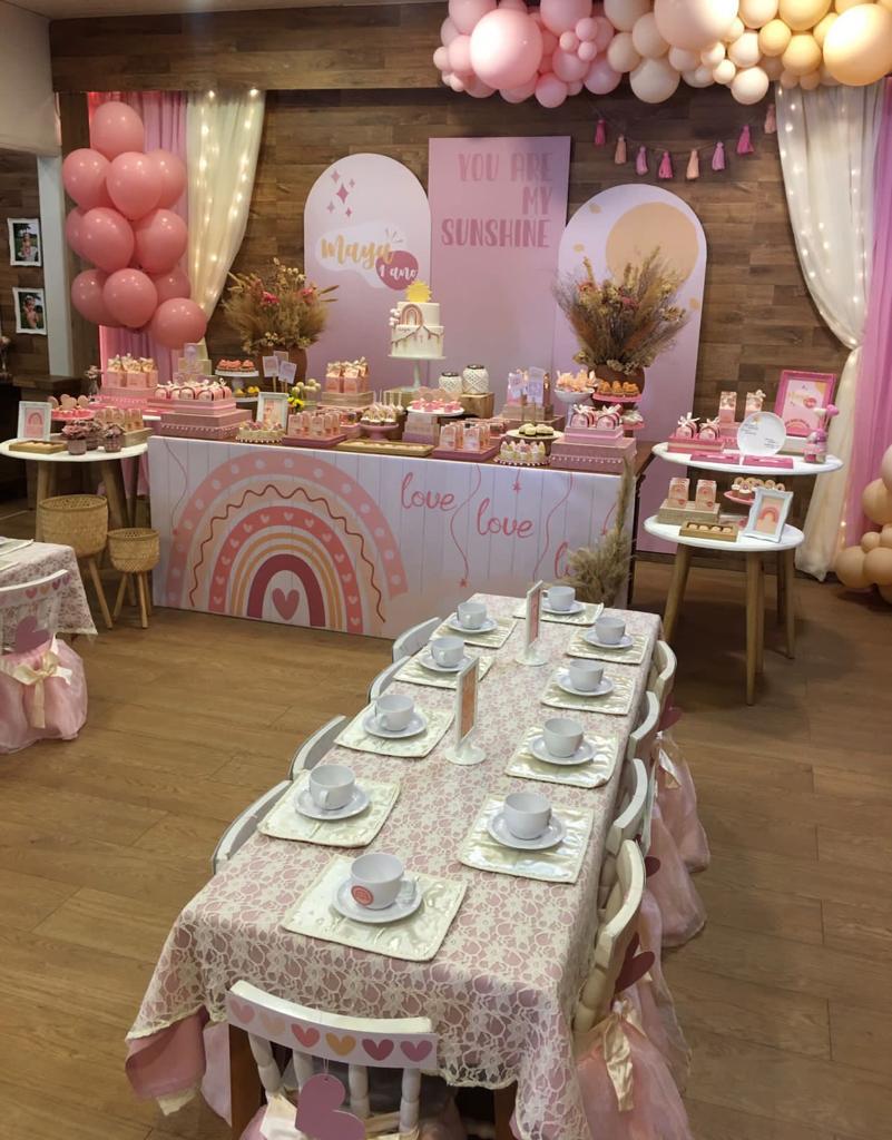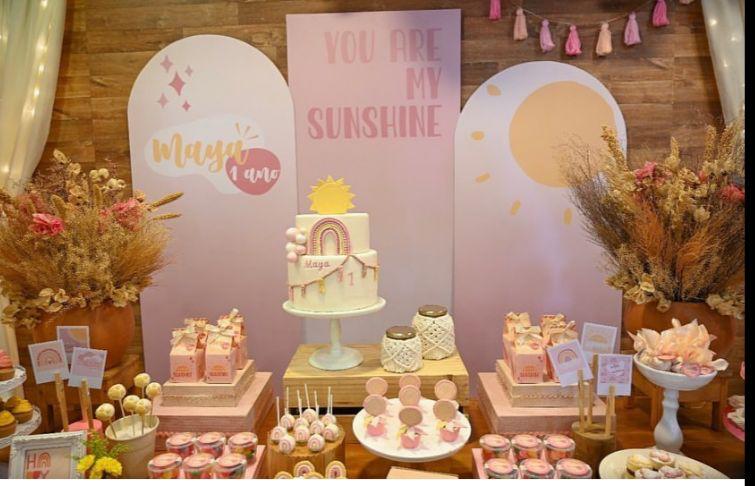 Bem-vindo a uma festa que celebra a alegria do sol em nossas vidas, com o tema “You are my Sunshine”! Este tema super meigo transmite felicidade e amor. Na decoração, criamos um ambiente elegante, com tons suaves do pôr do sol, que transmitem uma sensação de doçura e delicadeza. Elementos característicos como arco-íris, nuvens fofinhas, corações e flores irão decorar o espaço!